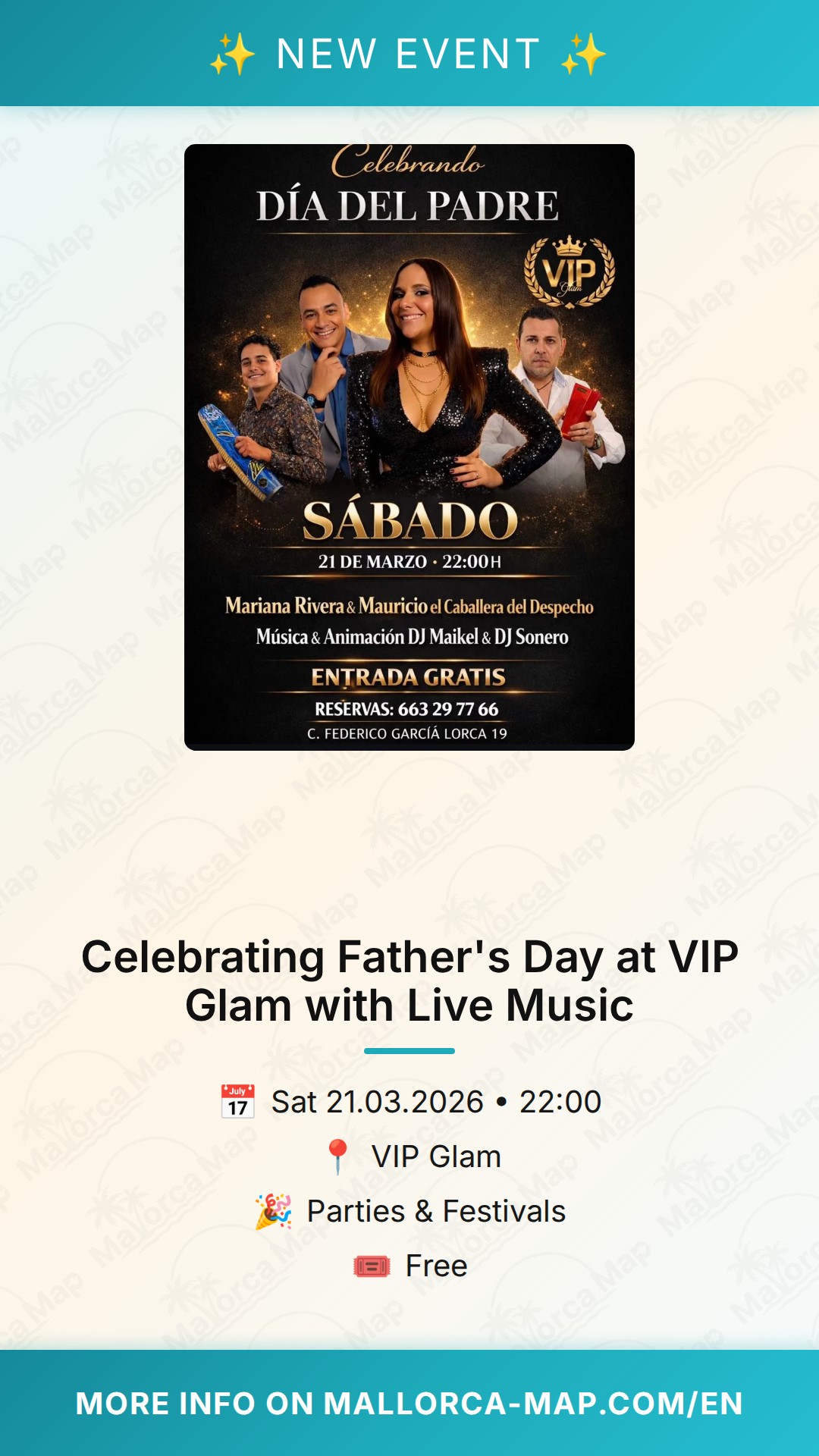 Located at Calle Federico García Lorca 19, VIP Glam provides the perfect backdrop for this special occasion. Whether you are coming with your father to show him a great time or joining a group of friends to celebrate together, the venue offers a welcoming and stylish environment. One of the best parts? The entry is completely free, making it an accessible and high-value option for your Saturday night plans in Palma.