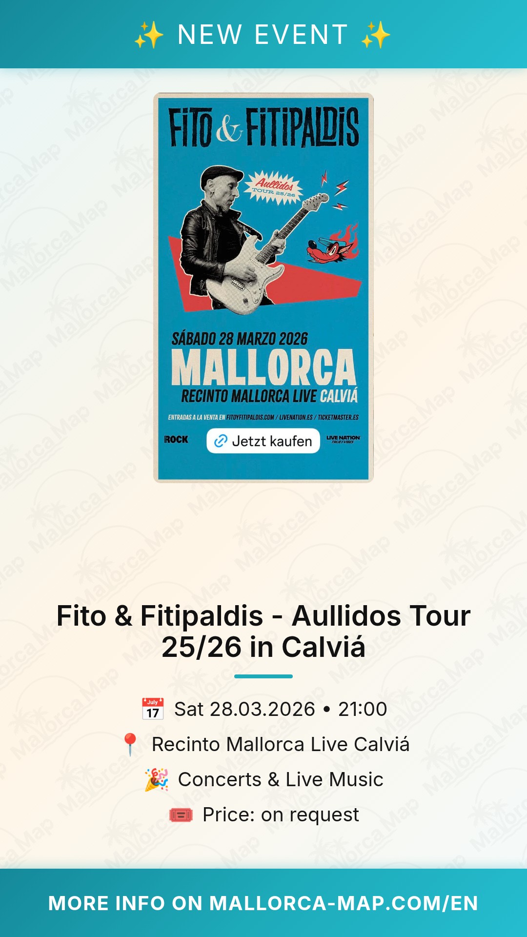 The show officially kicks off at 21:00 on March 28, 2026. We highly recommend arriving at the venue early to soak up the pre-concert vibes, enjoy some refreshments, and secure a great spot near the stage. The Recinto Mallorca Live is well-equipped with all the necessary amenities to ensure you have a comfortable and seamless experience throughout the night. Don't miss this rare opportunity to see one of Spain's most iconic rock acts performing live in such a spectacular setting. Grab your friends, mark your calendar, and prepare yourself for a night of pure rock and roll passion. Secure your tickets soon and get ready to howl along with Fito & Fitipaldis!