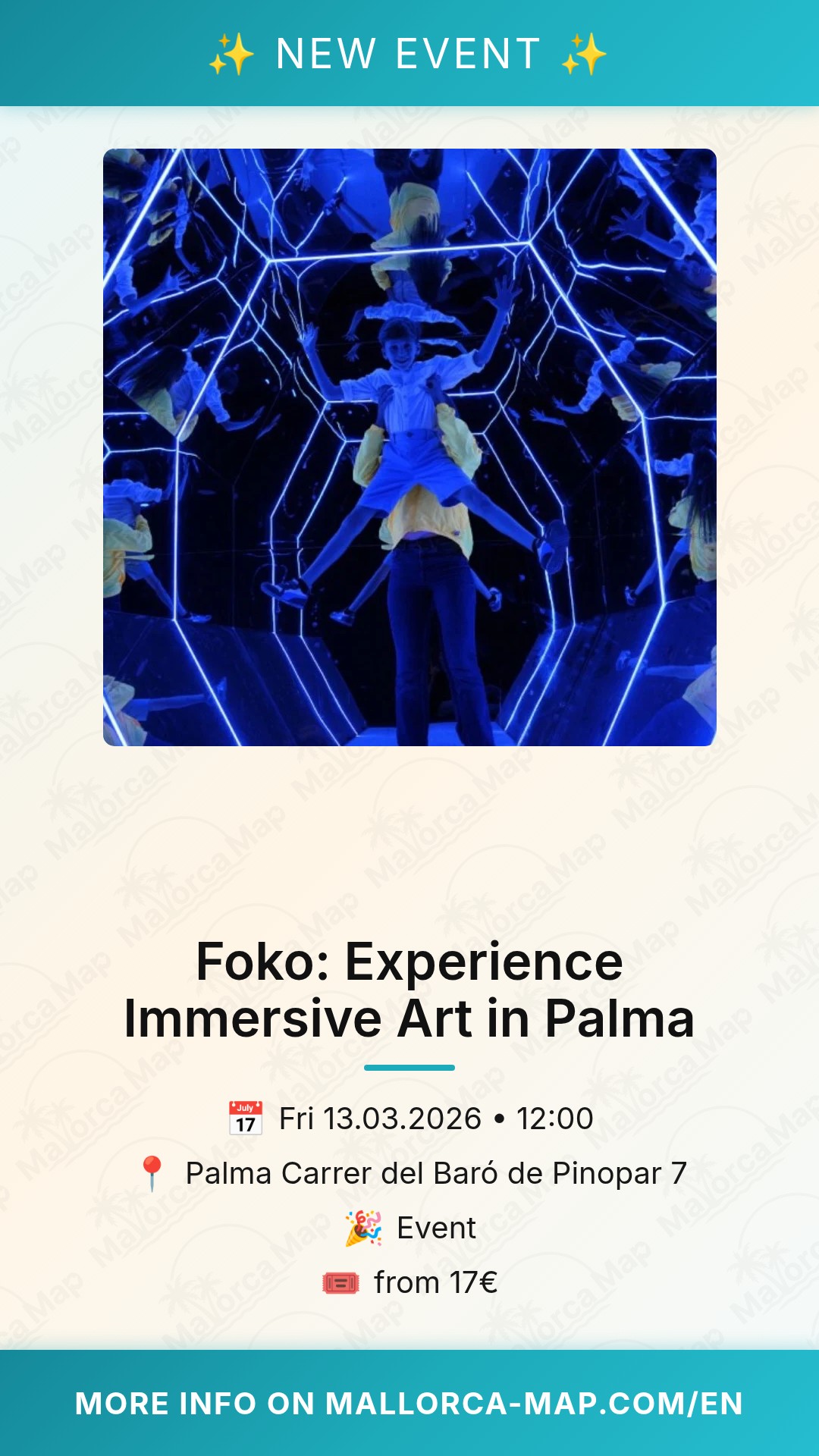 We recommend planning your visit in advance to ensure you have plenty of time to wander through each installation at your own pace. Immersive art is best enjoyed without rushing, so give yourself space to soak in every detail of the exhibition. If you are looking for a cultural highlight in Mallorca this March, Foko is an absolute must-see. Grab your tickets, bring your curiosity, and get ready to see art in an entirely new light. We cannot wait to see you there and hope you find as much inspiration in these works as we have. Don't miss out on this captivating addition to Palma's art scene—it is exactly the kind of creative energy the city thrives on.