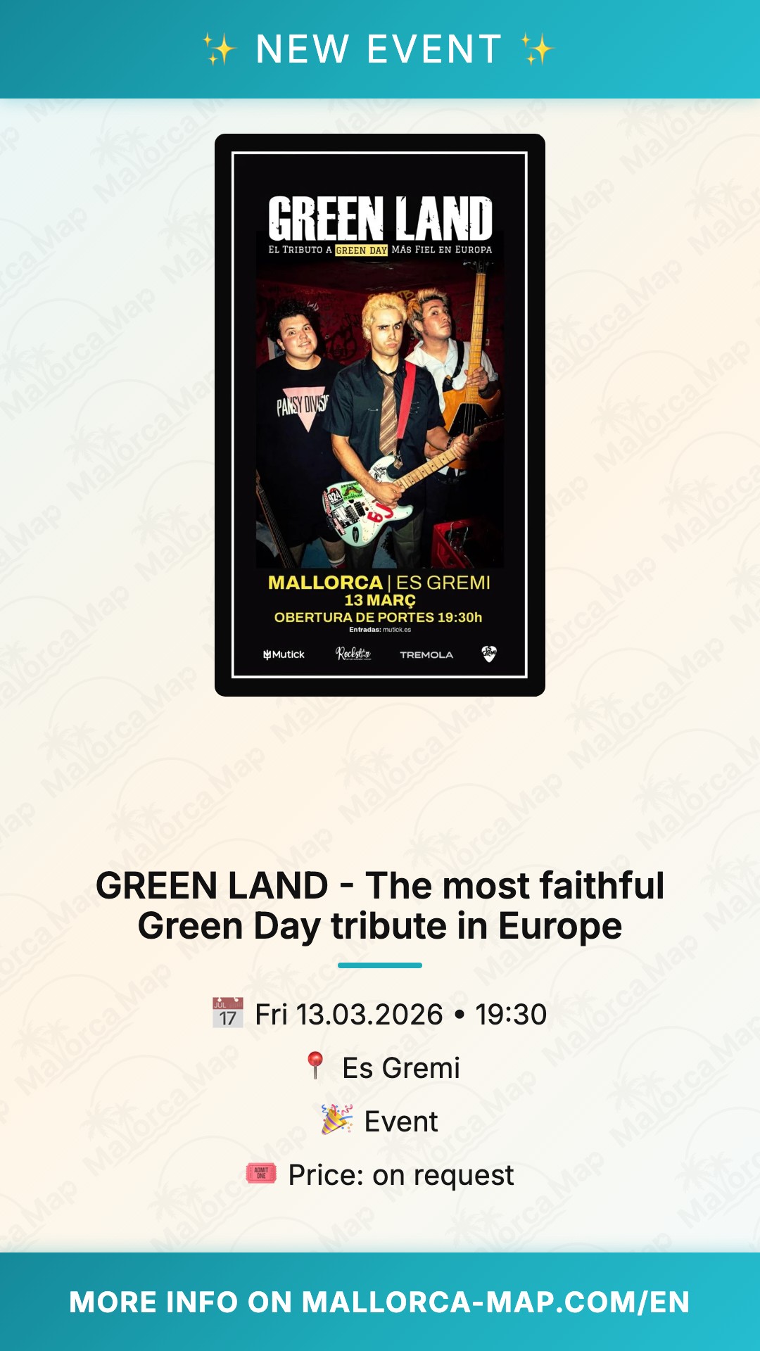 Are you ready to rock? On March 13, the ultimate live music experience comes to Palma as GREEN LAND takes the stage. This isn't just any show; it is widely considered the most faithful Green Day tribute in all of Europe. If you are a fan of high-energy punk rock, you cannot miss this incredible performance at the iconic Es Gremi venue. Mark your calendar and prepare for an unforgettable night of nostalgia and raw power.