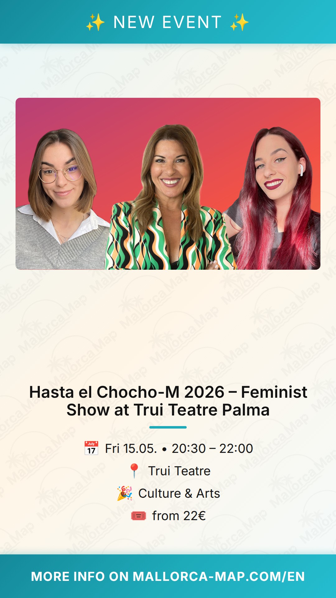 You can expect a unique intergenerational perspective as these three activists tackle the complexities of modern social issues and the challenges women face today. The show skillfully blends stand-up comedy, activism, and critical reflection, proving that humor is one of the most effective tools for social change. Following a record-breaking debut in Valencia with over 700 seats filled in record time, this tour brings a fresh, necessary vibe to the theatrical landscape of Mallorca. Each performer brings her own distinct style—Júlia’s analytical mind, Patricia’s legendary comedic timing, and Carla’s vibrant activism—creating a dynamic atmosphere that encourages the audience to think, feel, and, most importantly, enjoy the power of laughter in a safe and welcoming environment.