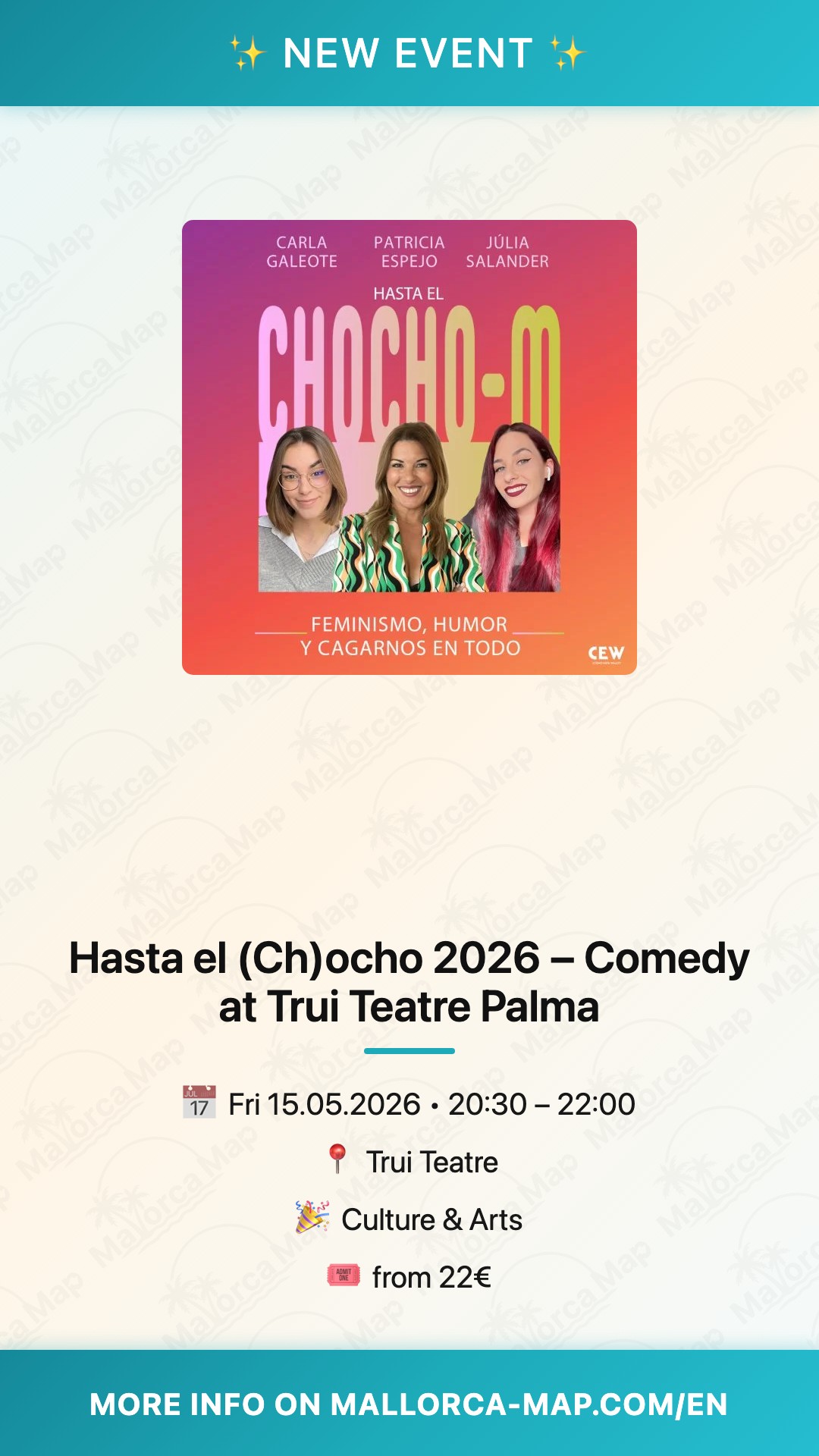 You are invited to witness one of the most anticipated comedy events of the season at the renowned Trui Teatre in Palma. On May 15, 2026, the stage comes alive with the witty and irreverent show Hasta el (Ch)ocho, promising an evening where humor takes center stage. This performance is more than just a monologue; it is a cultural experience that captures the vibrant spirit of modern Spanish entertainment right in the heart of Mallorca’s capital. From the moment the curtain rises at 20:30, you will be swept away by a performance that combines sharp wit with relatable life observations, making it a standout highlight in the local cultural calendar.