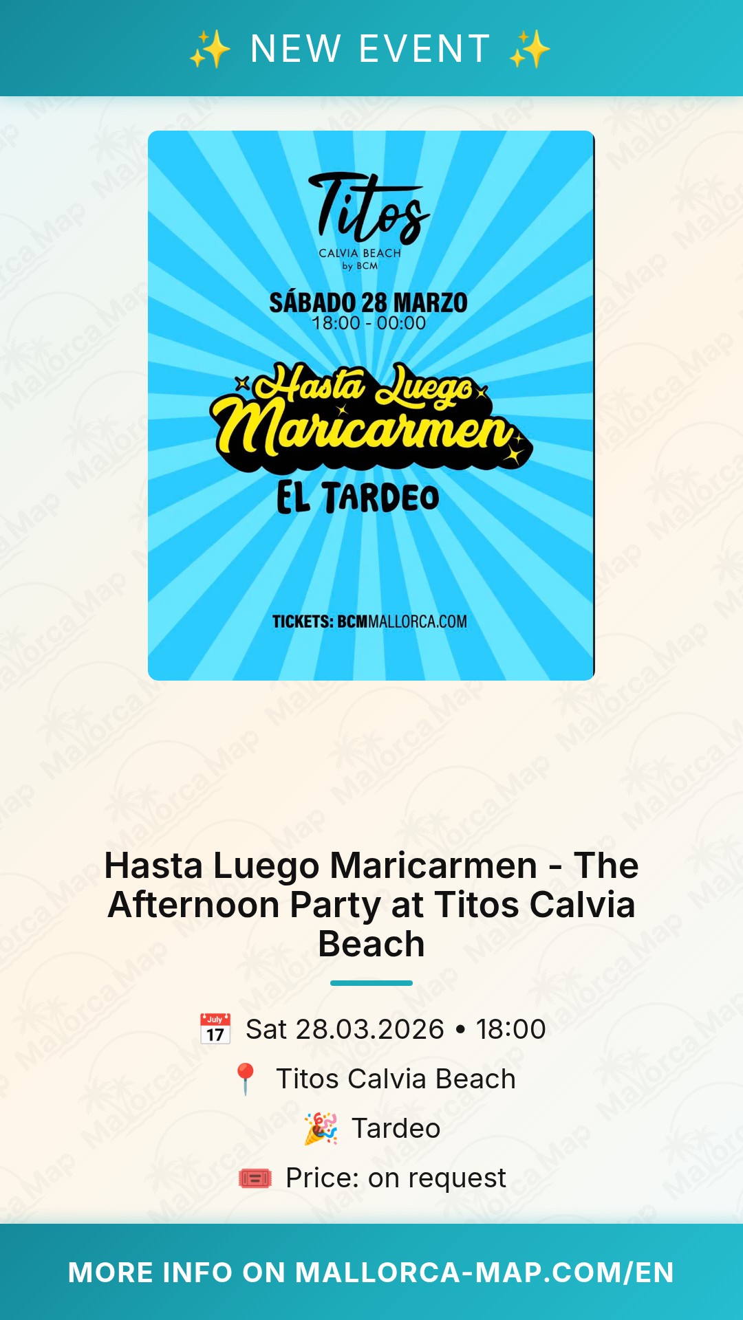 Why wait until midnight to start your weekend? The Tardeo concept is all about maximizing your day. At Titos Calvia Beach, you will find yourself surrounded by a stylish crowd, refreshing cocktails, and a soundtrack that perfectly transitions from chill afternoon beats to high-energy anthems. The venue itself offers stunning views and a premium setting that makes every moment feel special. Whether you are a local or visiting Mallorca, this event captures the true essence of modern island nightlife—even if it starts while the sun is still up. You will enjoy the signature "Hasta Luego Maricarmen" hospitality, known for its fun-loving spirit and inclusive energy.