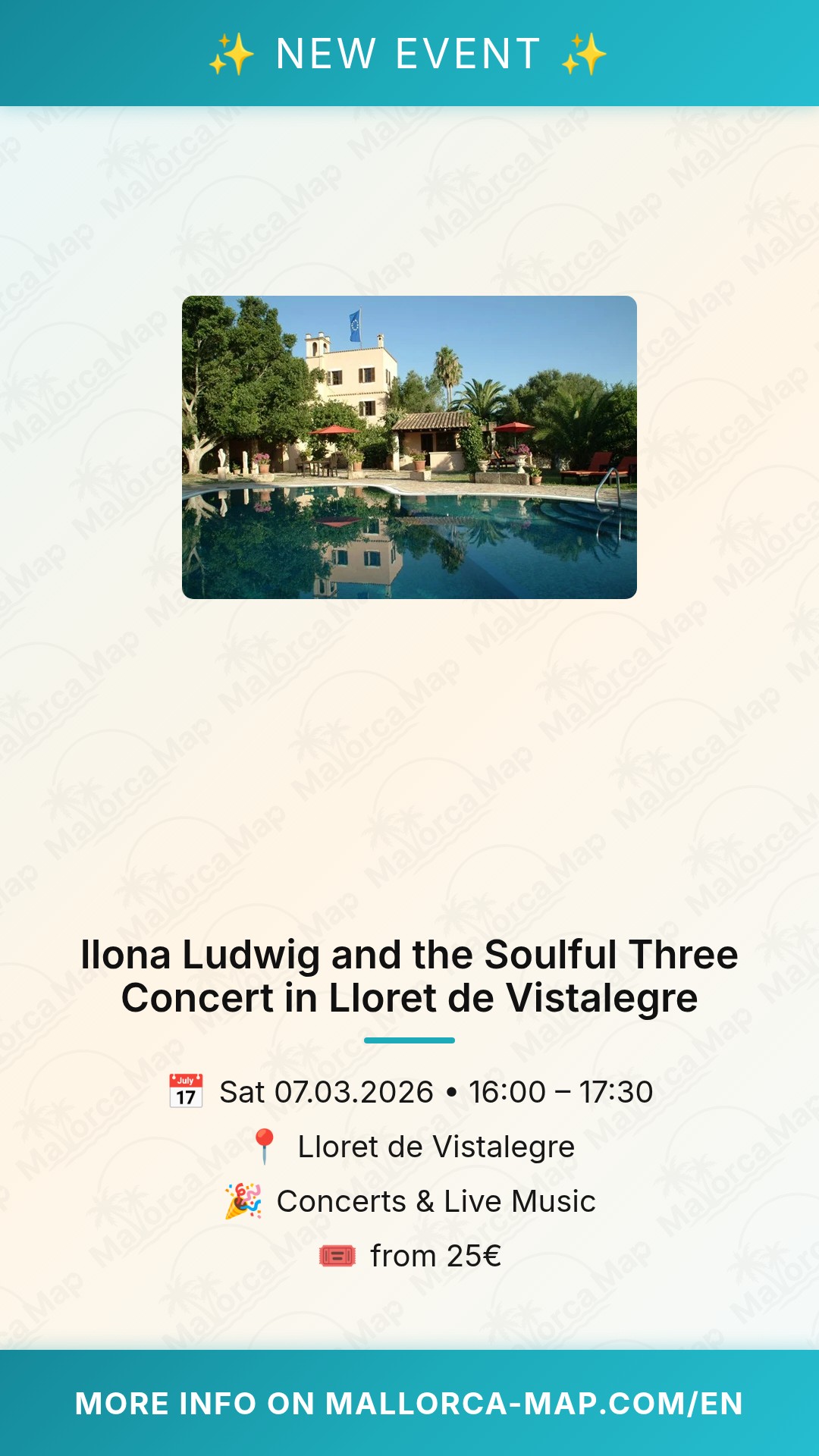Don't miss this chance to experience a heartfelt performance in one of Mallorca's most beautiful hidden gems. Whether you are a fan of classic soul or simply looking for a high-quality cultural outing, Ilona Ludwig and the Soulful Three will provide an unforgettable Saturday afternoon. We look forward to seeing you there!