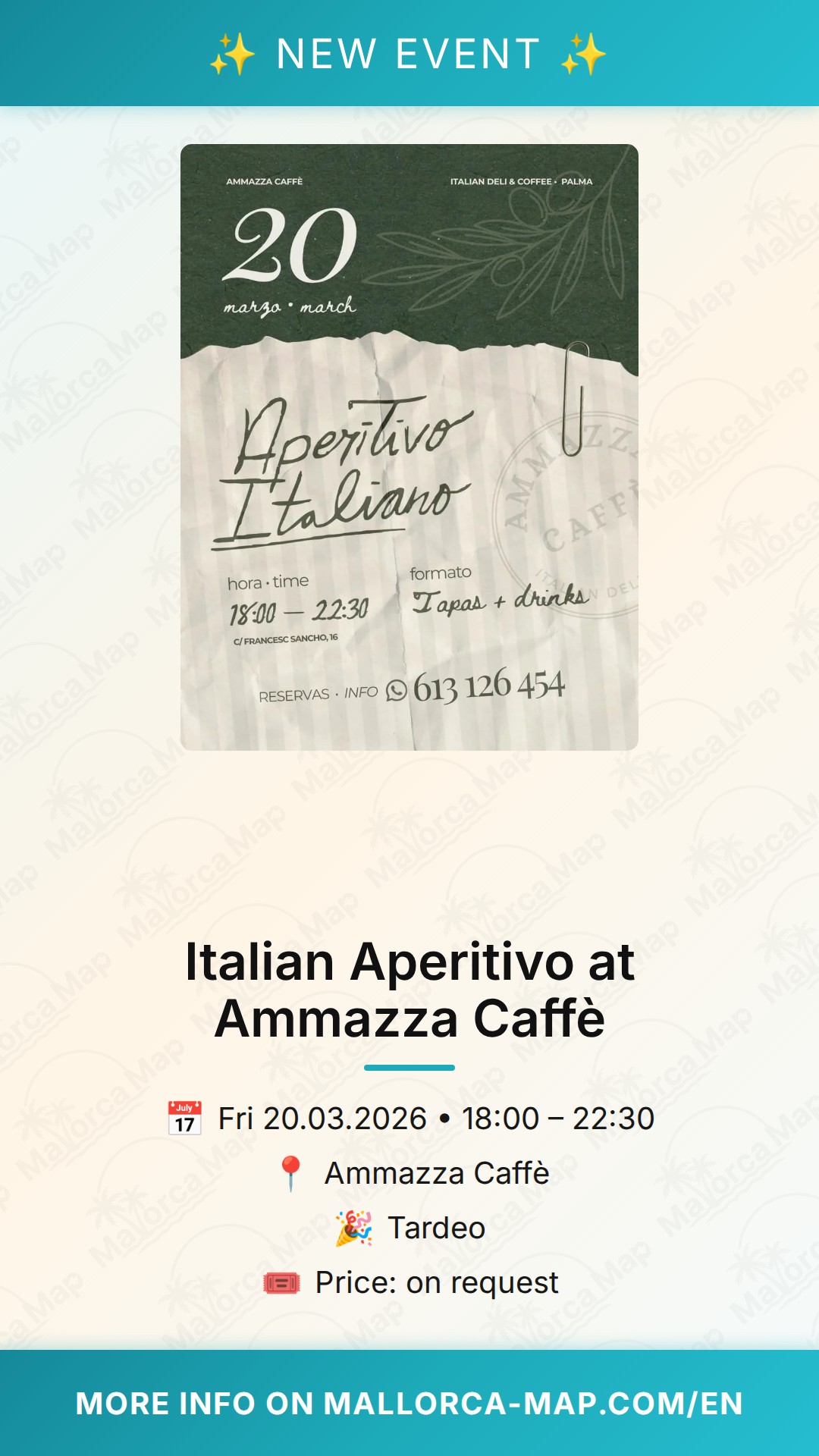 The venue itself is known for its cozy and stylish interior, making it a favorite spot for those who appreciate good taste and a friendly vibe. The event starts at 6:00 PM, making it a quintessential "tardeo" experience—that wonderful Spanish tradition of starting the party early so you can enjoy the evening to the fullest without staying up until dawn. No matter if you are coming alone to meet new people or bringing a group of colleagues, the Italian Aperitivo at Ammazza Caffè is the place to be. Make sure to mark your calendar for March 20th and head over to Palma's 07004 district. We look forward to seeing you there for a glass of something cold and a plate of something delicious. Cheers to a perfect evening in Palma!