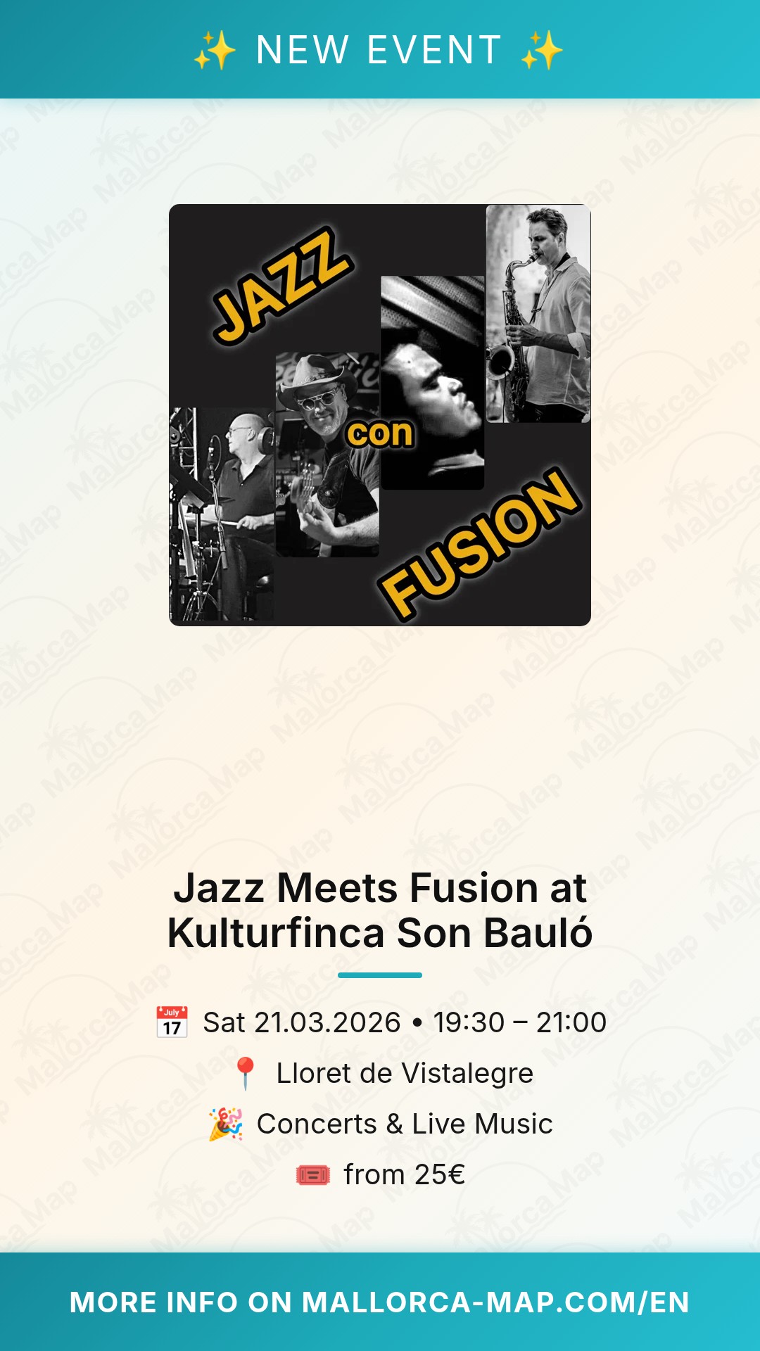 If you are looking for a unique musical experience that blends the sophistication of jazz with the raw energy of rock, then "Jazz Meets Fusion" at Kulturfinca Son Bauló is an event you cannot miss. On Saturday, March 21st, 2026, the tranquil village of Lloret de Vistalegre becomes the stage for JazzconFusion, a band that perfectly embodies the international spirit of Mallorca. This group of world-class musicians has come together on the island to create a sound that is both groovy and deeply moving, designed to touch your soul and get your feet tapping.