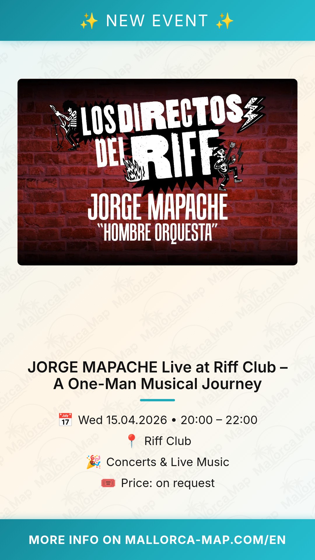 Get ready for a unique musical experience in Mallorca as JORGE MAPACHE brings his "Hombre Orquesta" show to the Riff Club on April 15, 2026. If you appreciate raw talent and innovative live performances, this is an evening you simply cannot miss.