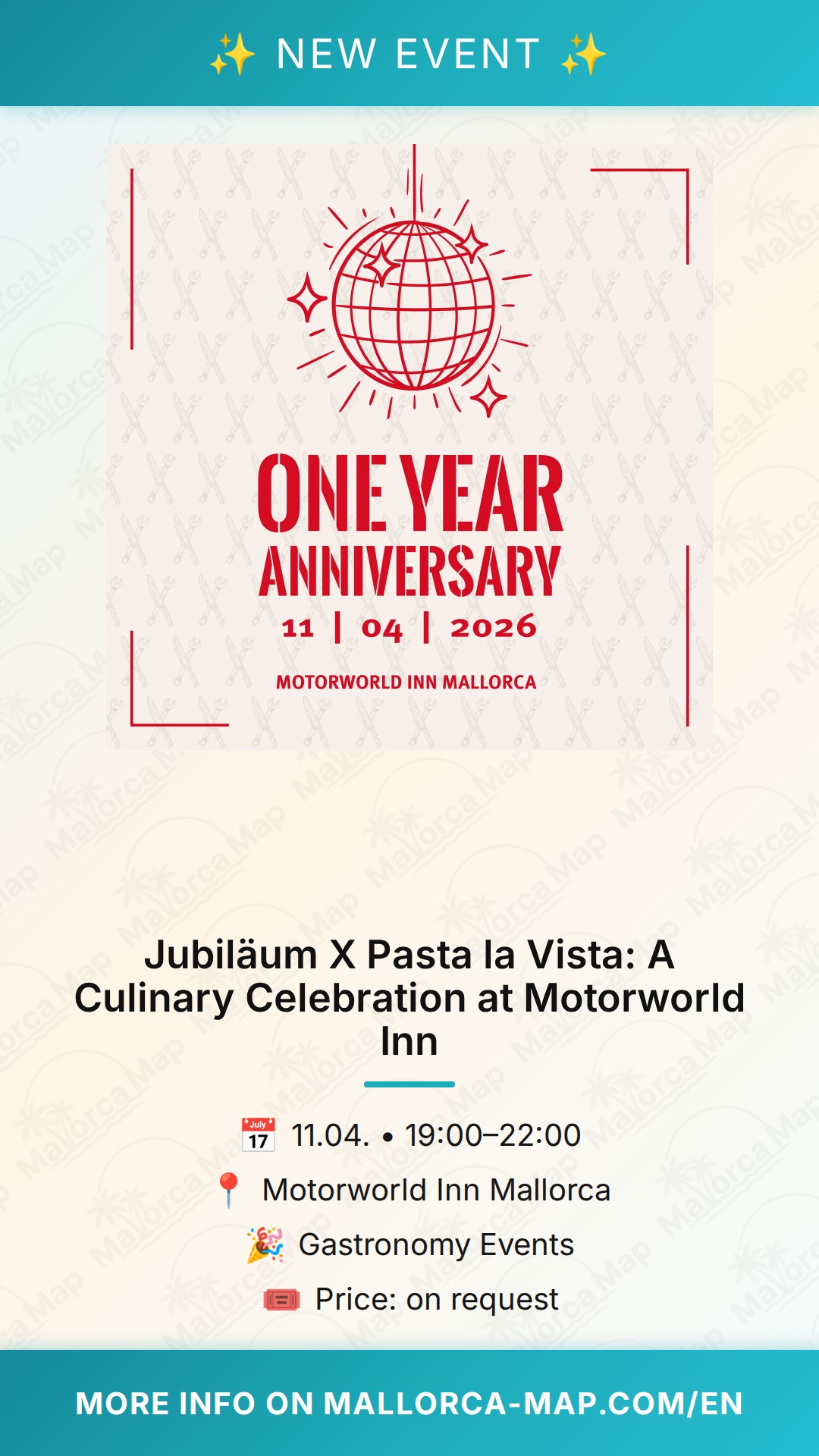 Ready to reserve your place? While specific pricing is provided on request, we encourage you to head over to Mallorca-Map.com/en for the latest updates and further details regarding the event program. Don't miss this chance to be part of the Jubiläum X Pasta la Vista. Gather your friends, bring your appetite, and join us for an unforgettable evening in the heart of Mallorca’s vibrant event scene. We look forward to seeing you there and celebrating this special occasion together in true Mediterranean fashion.