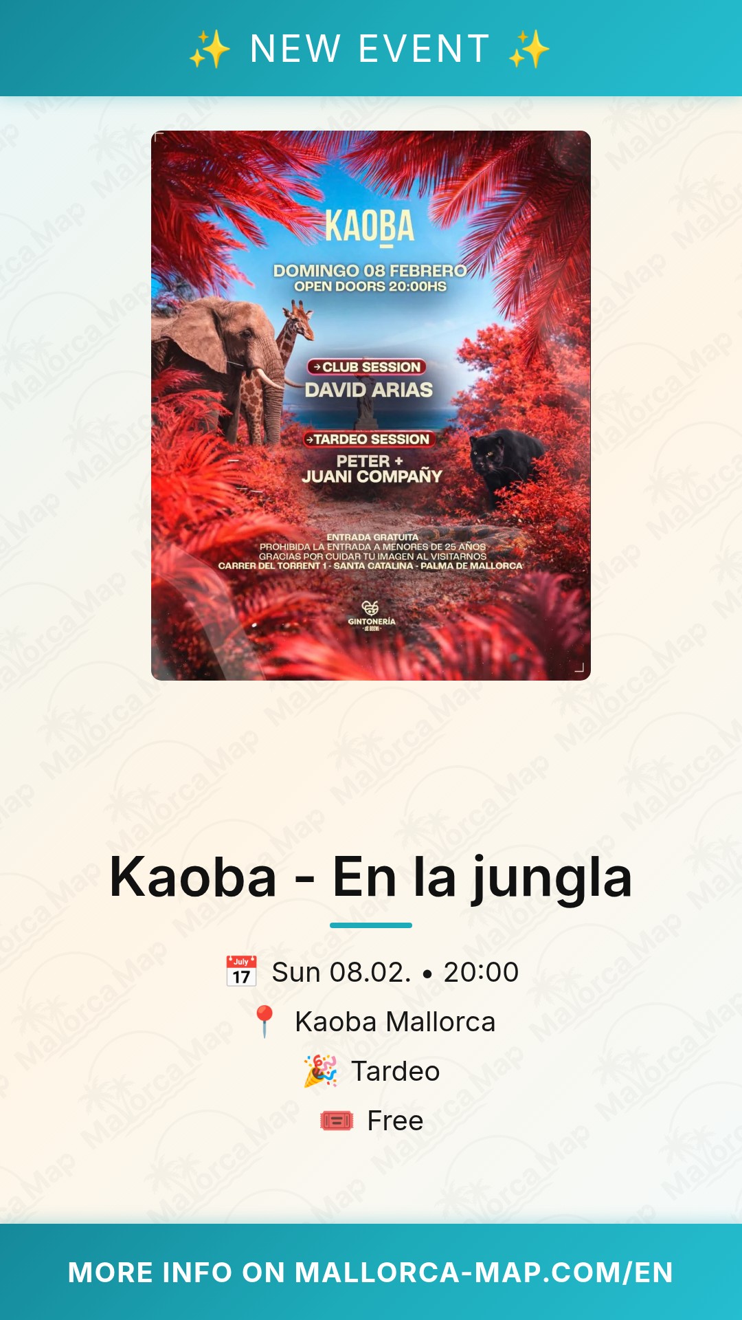 You experience an exotic transformation in the heart of Palma as Kaoba Mallorca presents a special edition of their famous sessions. On February 8th, 2026, the venue at Carrer del Torrent 1, Santa Catalina, Palma de Mallorca becomes the epicenter of the island's nightlife with "Kaoba - En la jungla." Starting at 20:00, this event perfectly captures the spirit of the Mediterranean night, inviting you to lose yourself in a wild yet sophisticated atmosphere that only the trendy district of Santa Catalina can provide.