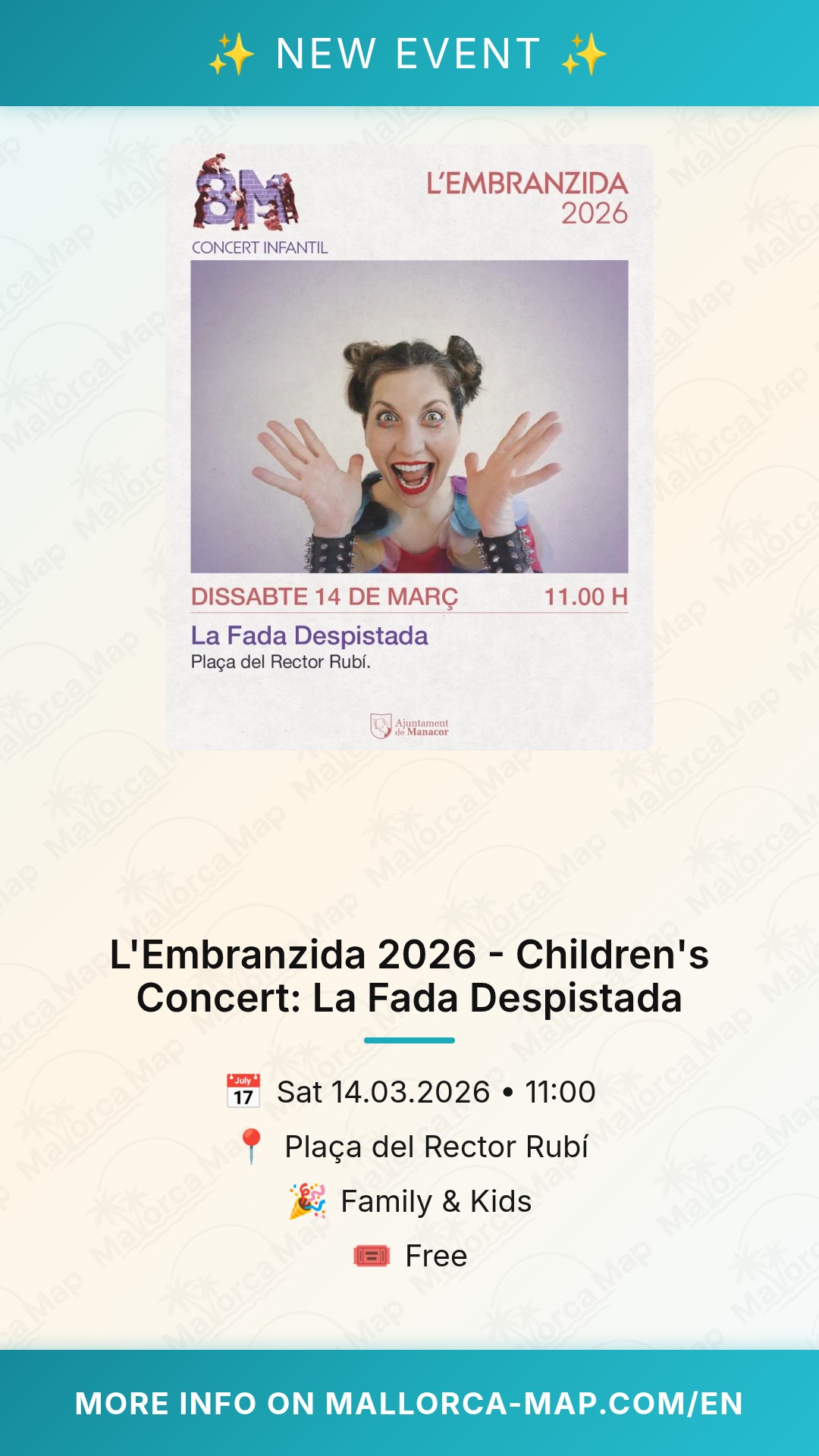 As part of the L’Embranzida festival, this concert is completely free of charge, making it an accessible and stress-free way to spend your Saturday morning. The show starts at 11:00 AM, which is the perfect time to enjoy the fresh air before the midday sun. We recommend arriving a little early to find a good spot and soak in the local vibe. After the concert, you are in the perfect position to explore more of what Manacor has to offer. You could visit the local market, grab a traditional pastry at a nearby bakery, or simply wander through the historic streets of this charming town. This event is all about community, joy, and creating lasting memories with your loved ones. So, grab your sun hats and join us for a magical musical journey with La Fada Despistada!