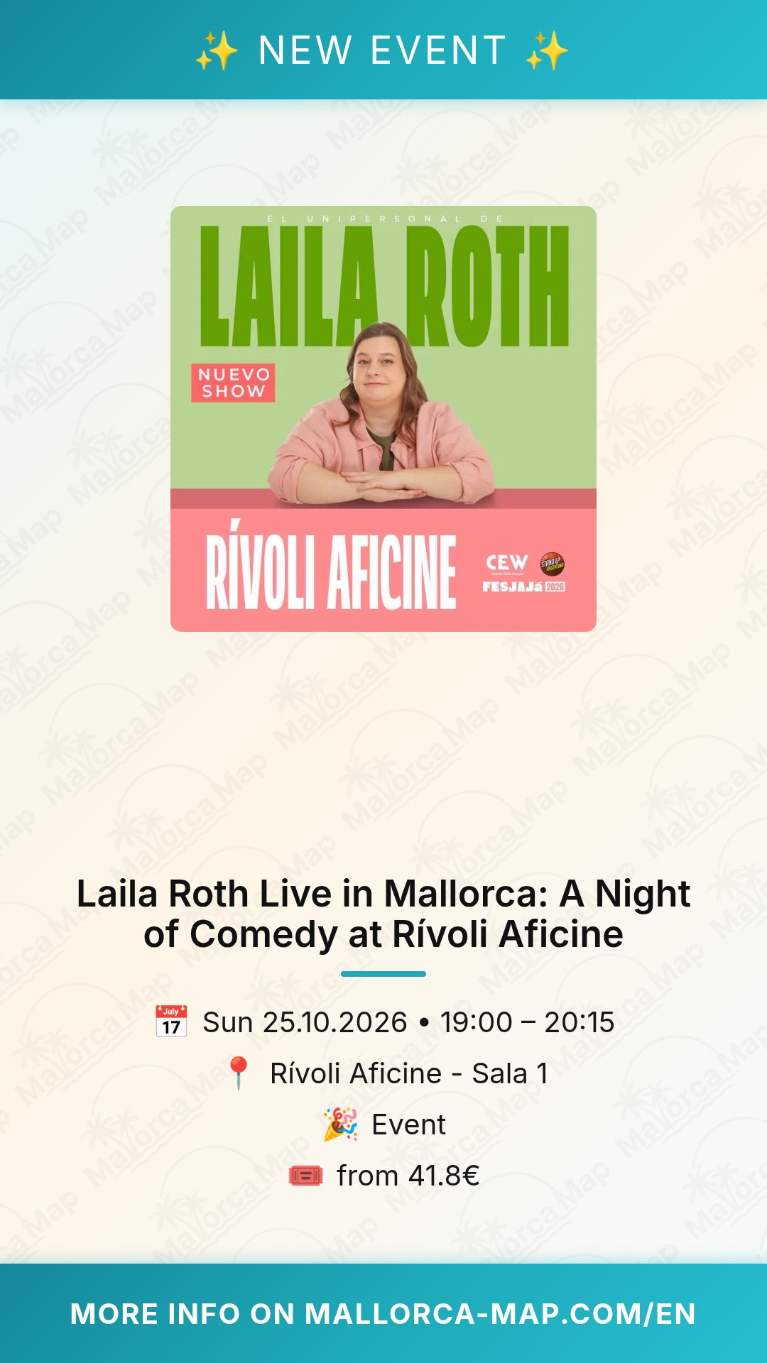 Make sure to mark your calendar for October 25, 2026. As these types of performances often sell out, it is highly recommended to secure your spot early. Don't miss the chance to see Laila Roth live on stage; it is set to be one of the comedic highlights of the season on the island. Grab your friends, head to the Rívoli Aficine, and get ready for a night of pure, unadulterated fun. We look forward to seeing you there for a memorable night of laughter in Mallorca!