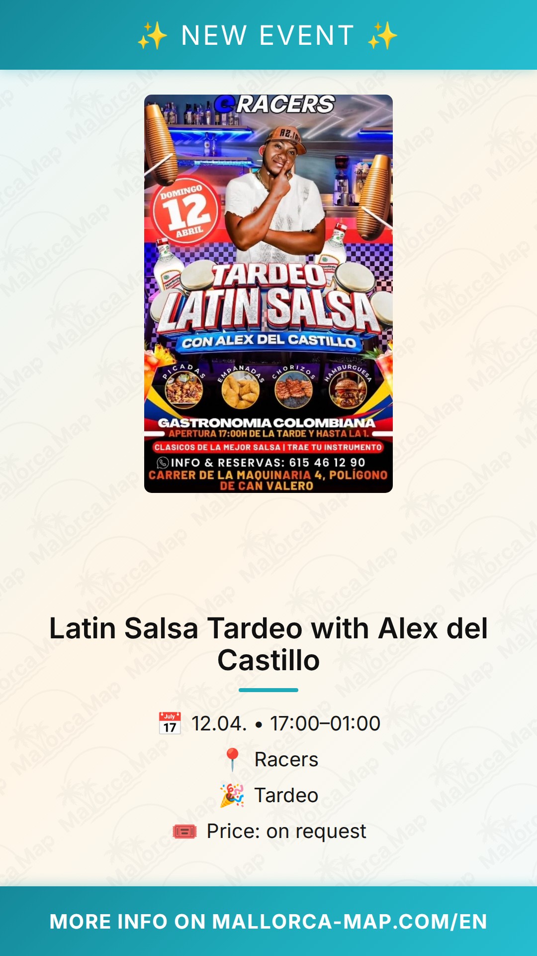 The event kicks off at 17:00 on Sunday, April 12th. Racers provides the perfect industrial-chic backdrop for this high-energy gathering. Whether you are a seasoned salsa dancer or just looking for a fun way to spend your Sunday afternoon with friends, you will find a warm welcome and a vibrant dance floor. Grab your friends, bring your instruments if you have them, and get ready to dance the afternoon away in the heart of Palma. See you on the dance floor!