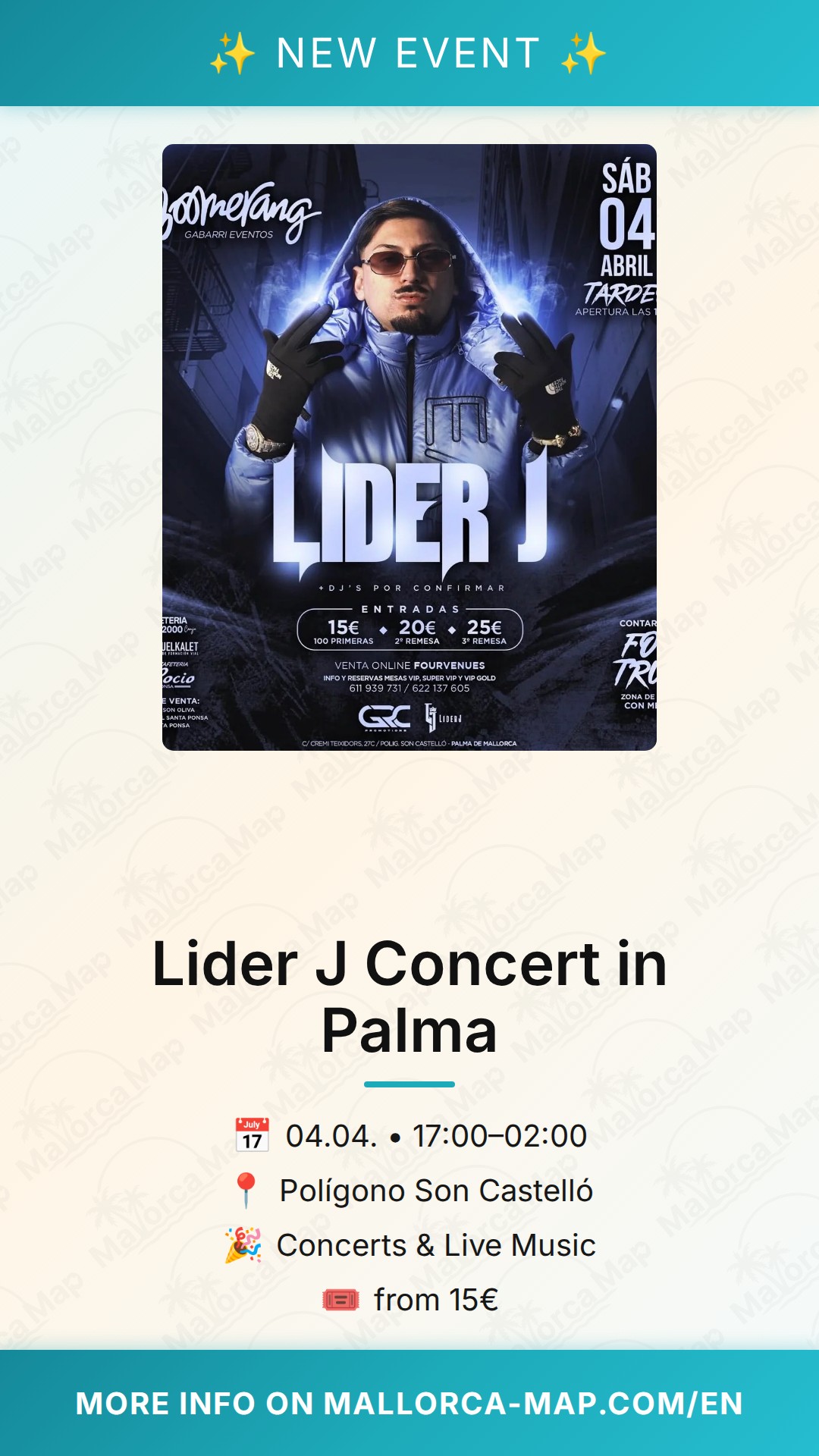 Get ready for an electrifying evening in Mallorca as Lider J takes the stage in Palma. On April 4th, 2026, the Polígono Son Castelló will transform into a hub of rhythm and energy for this highly anticipated performance. Presented by Boomerang Gabarri Eventos, this event promises to be a highlight for music lovers looking for an authentic local vibe and high-quality production. Whether you are a resident or visiting the island, this is your chance to experience the urban sounds of Lider J in a space known for its vibrant atmosphere.
