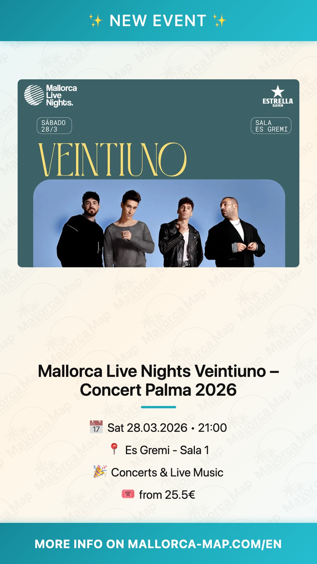 Head to Gremi de Porgadors 16 in Palma's 07009 postcode for easy access via public transport or a short walk from the city center. Secure your spot early for this highlight of Mallorca's 2026 live music scene – don't miss Veintiuno lighting up the night!