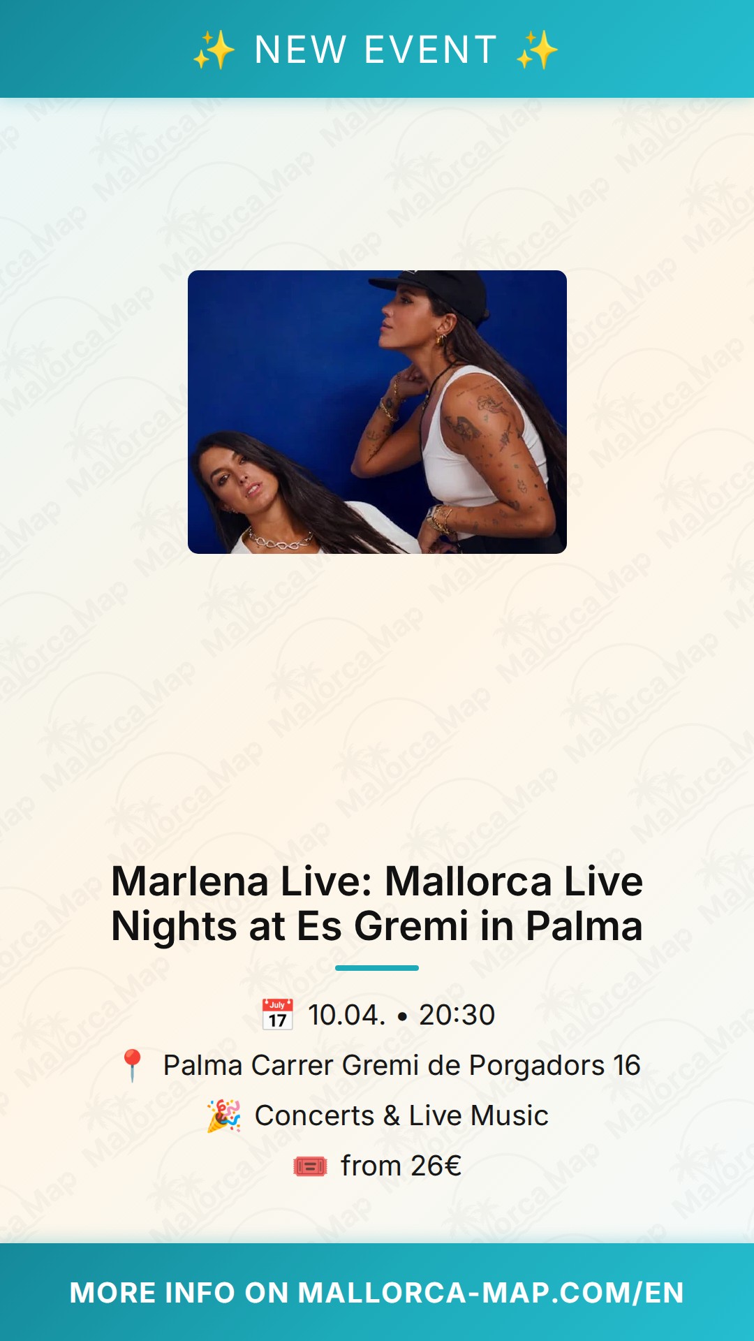 Get ready for an unforgettable musical experience in the heart of Palma! As part of the exciting Mallorca Live Nights series, the dynamic duo Marlena is taking the stage at Es Gremi on April 10, 2026. If you are looking for the perfect way to spend your Friday evening, this is the place to be.
