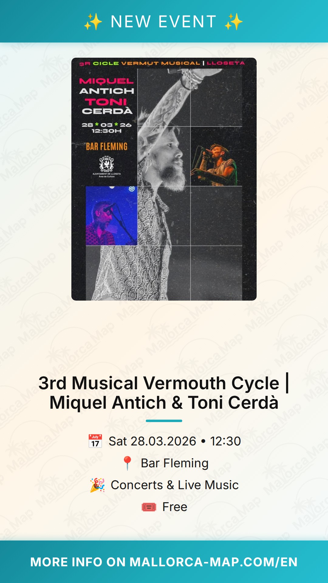 Welcome to a perfect Saturday afternoon in the heart of Mallorca. If you are looking for a blend of local culture, great music, and a relaxed atmosphere, the 3rd Musical Vermouth Cycle in Lloseta is exactly where you need to be. On March 28th, Bar Fleming opens its doors for a special performance featuring the talented Miquel Antich and Toni Cerdà. This event isn't just a concert; it's a celebration of the Mediterranean lifestyle where music and social gathering meet over a glass of vermouth.