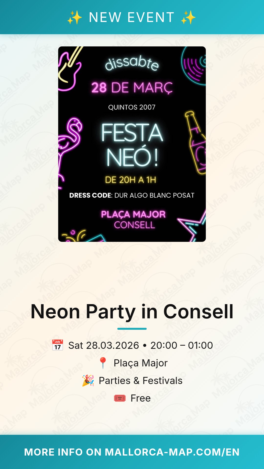 One of the best parts of this event is that entry is completely free. It is a fantastic way to spend a Saturday night without breaking the bank, offering a high-quality entertainment experience for everyone. Consell is easily accessible from Palma and other parts of the island, making it a great destination for a weekend excursion. Before the party kicks off, you might want to explore the local streets or enjoy a drink at one of the nearby bars to soak in the pre-event excitement. Don't miss out on this chance to see Consell in a whole new light. Grab your friends, put on your neon gear, and head to Plaça Major for a night of music, dancing, and glowing memories. We look forward to seeing you there!