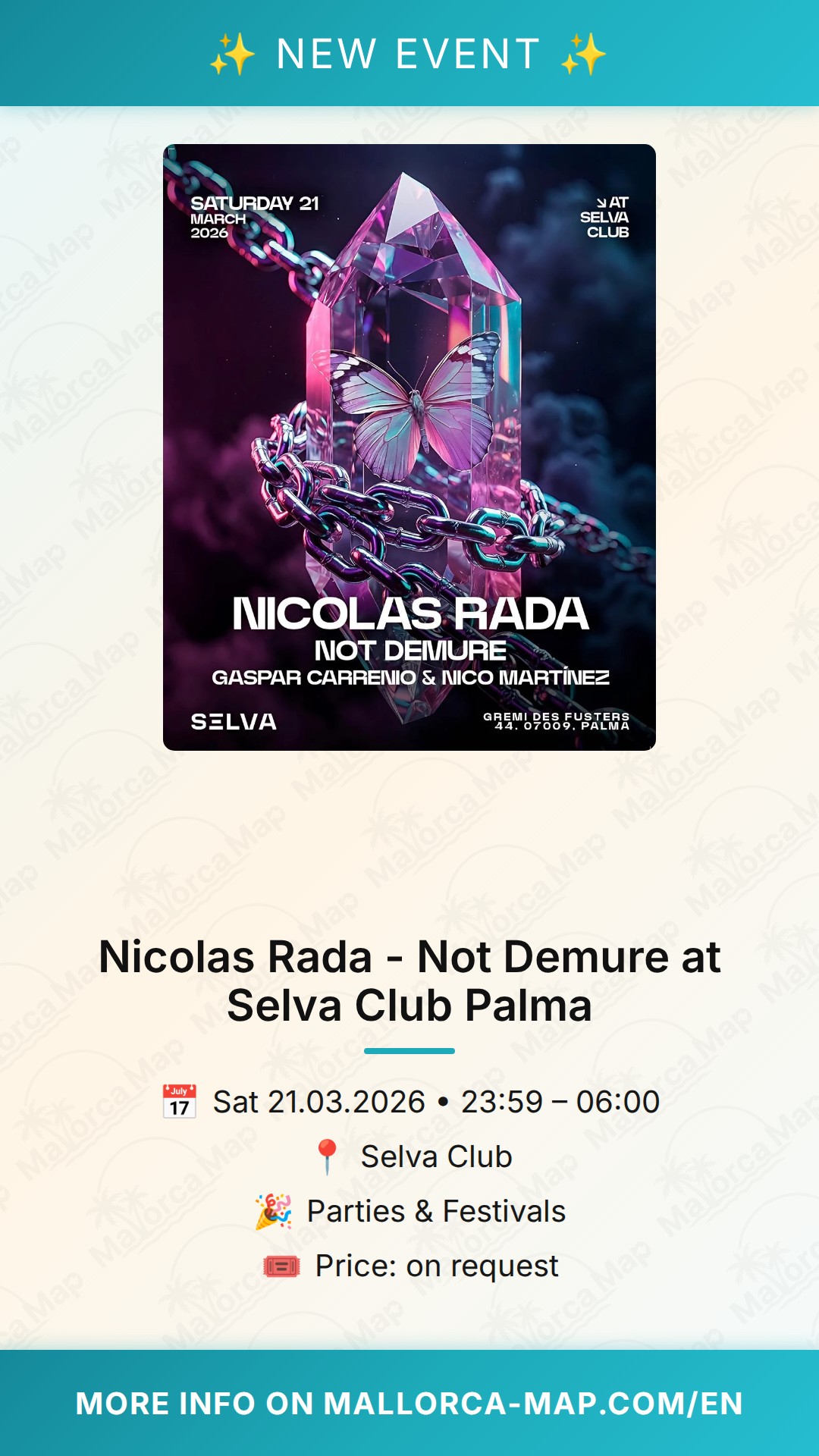 Make sure to gather your friends and prepare for a night of dancing and discovery. Palma’s nightlife is evolving, and events like this are at the forefront of that change. See you on the dancefloor at Selva Club for a night headlined by Nicolas Rada and Not Demure – it’s going to be a highlight of the season!
