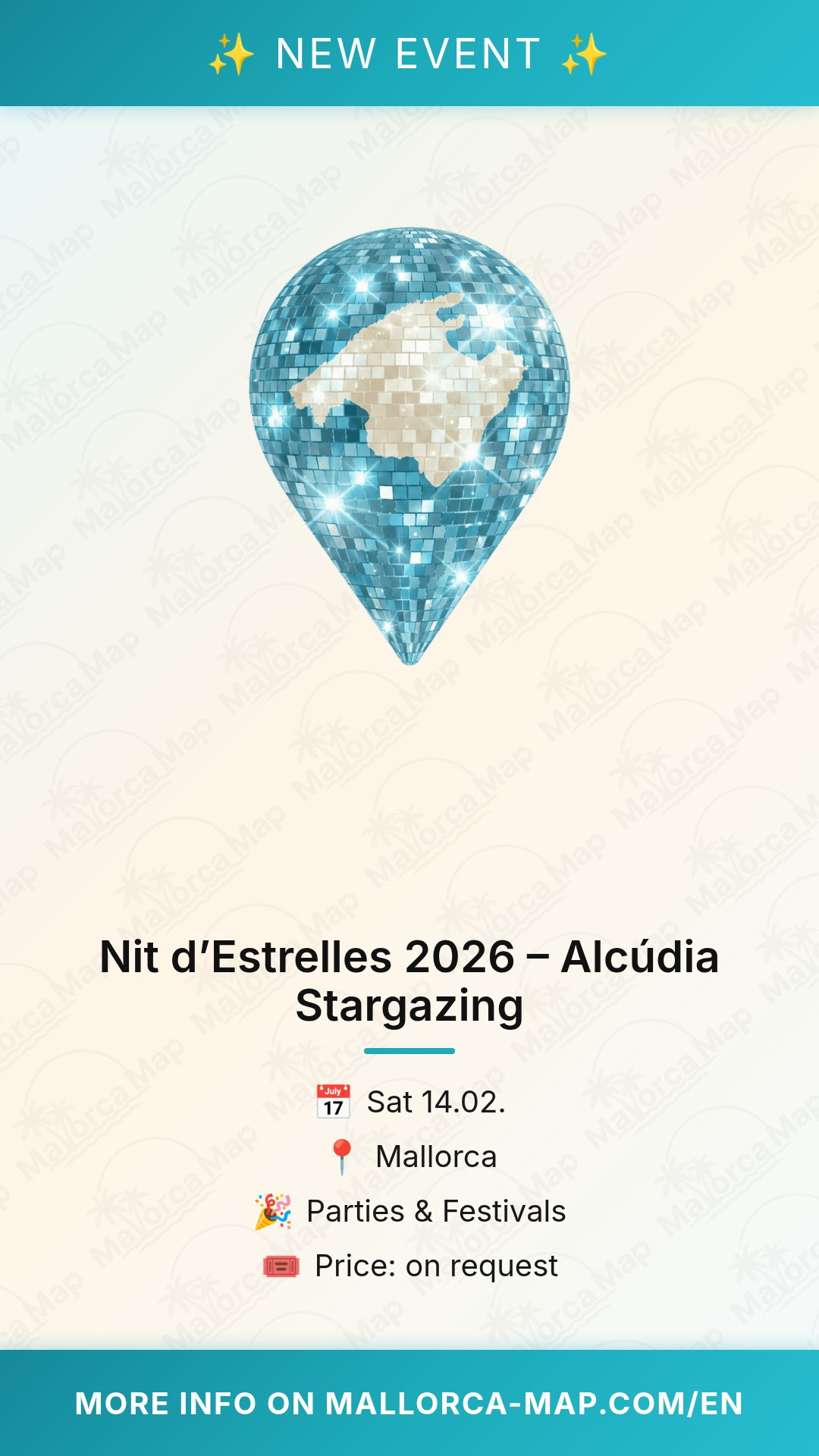 Since the event takes place outdoors in February, you should wear warm, comfortable clothing and sturdy shoes for the walk to the viewpoint. This is a popular gathering, so arriving early is recommended to secure a good spot. Don't miss this magical night under the stars in one of Mallorca's most beautiful locations. Grab your friends or partner and head to Alcúdia for a night you will always remember.