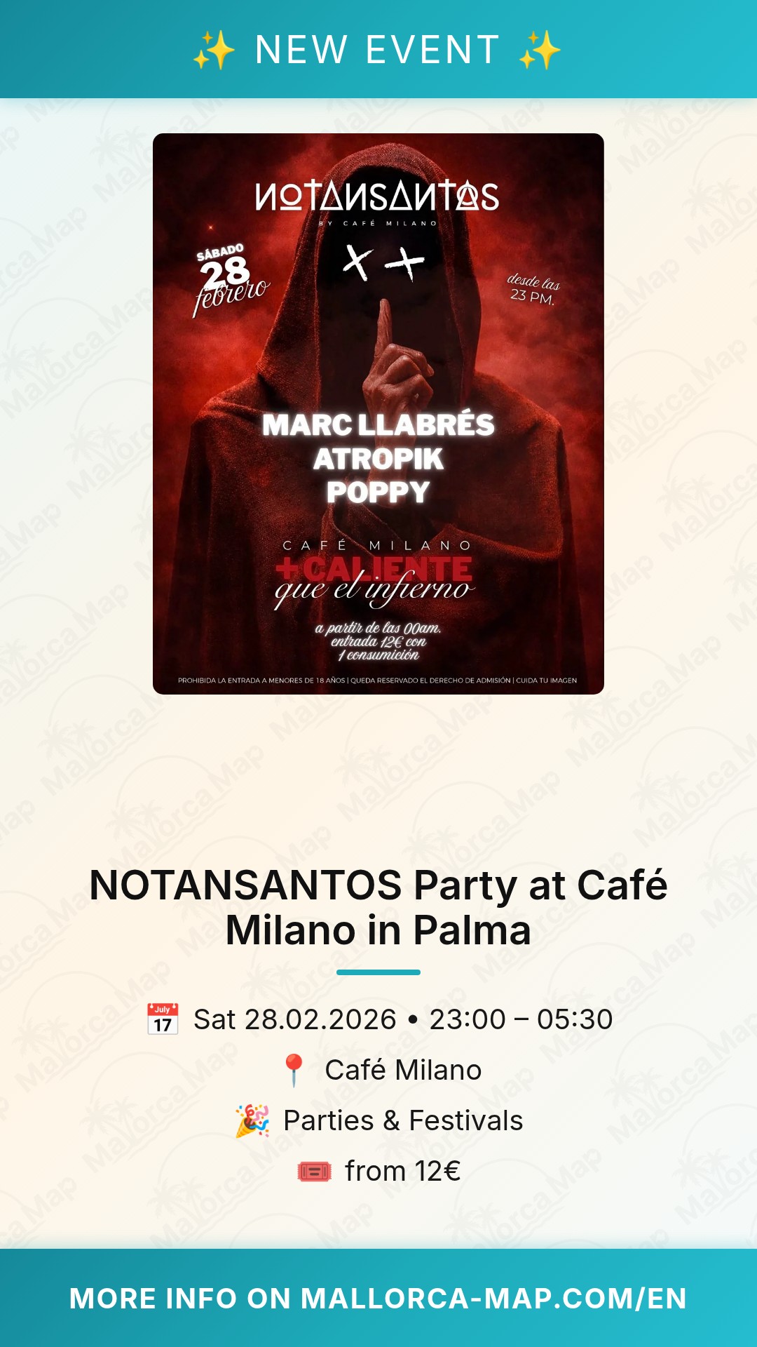 Are you ready to experience one of the most intense nights in the heart of Mallorca? On February 28th, Café Milano transforms into the ultimate nightlife destination with the return of the legendary NOTANSANTOS party. Located on the iconic Carrer de la Unió in Palma, this event promises an atmosphere that is, quite literally, hotter than hell. If you are looking for a place where the music is loud, the drinks are cold, and the energy is electric, this is exactly where you need to be for an unforgettable Saturday night.