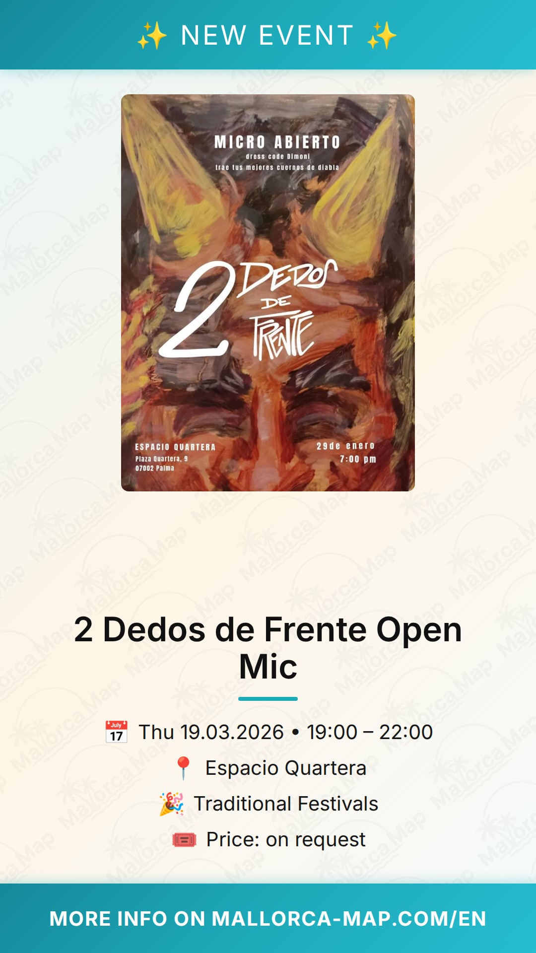 If you are planning to attend, we recommend arriving a bit early to secure a good spot in this cozy venue. Since it is located in the bustling center of Palma, public transport or a short walk from nearby parking areas is the best way to reach Plaza Quartera. The event offers a modest and accessible way to spend an evening, perfect for friends or solo travelers wanting to dive deep into the local scene. Don't miss this chance to be part of one of the most authentic cultural events in Mallorca this winter!