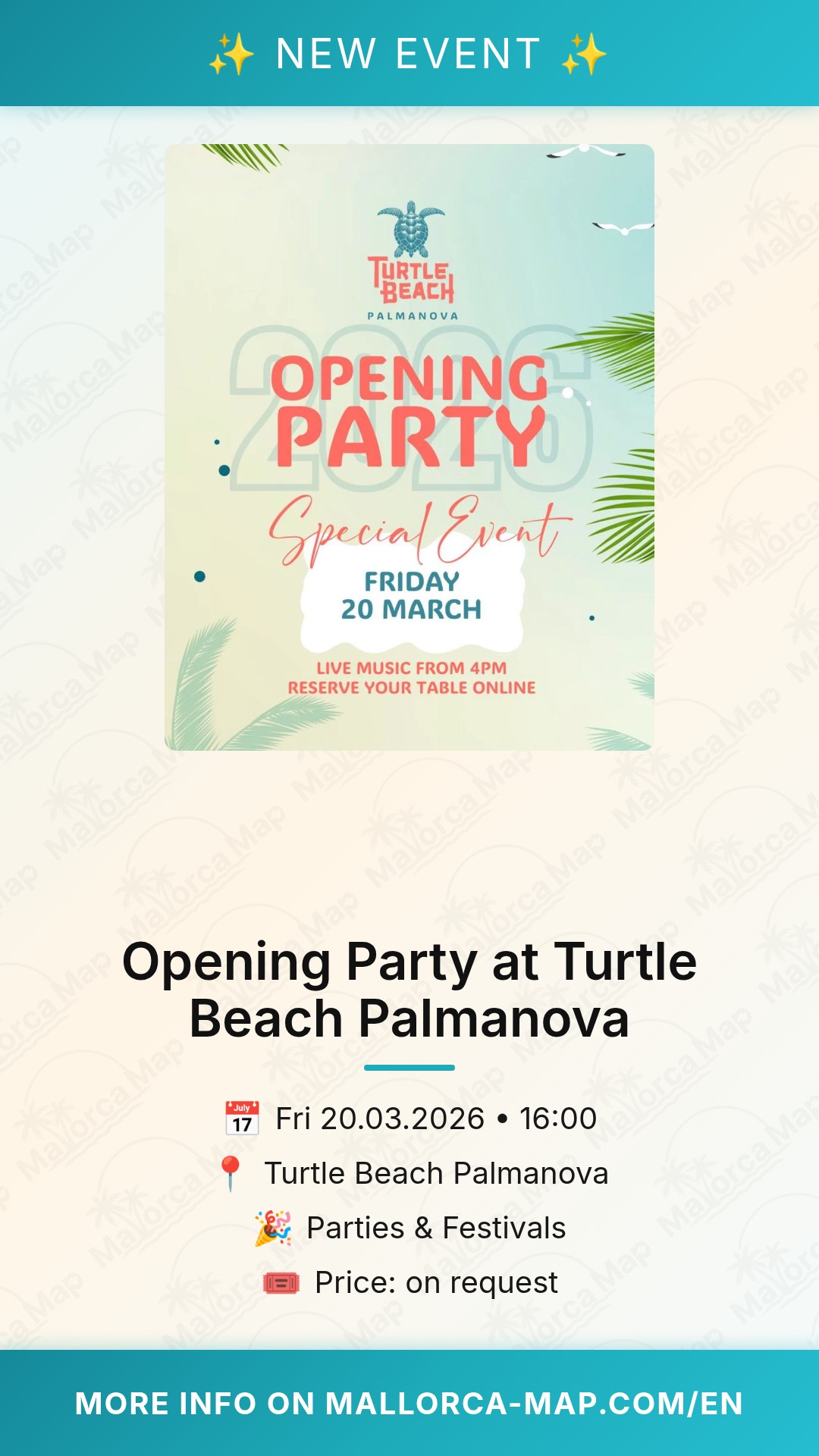 Don’t miss out on the chance to be part of the first big event of the year at Turtle Beach. Grab your sunglasses, bring your best mood, and join us for an afternoon filled with rhythm, laughter, and the unmistakable spirit of Mallorca. We can't wait to see you there and start this new season together with a bang. Make sure to head over to Palmanova on March 20th and let the music take over!