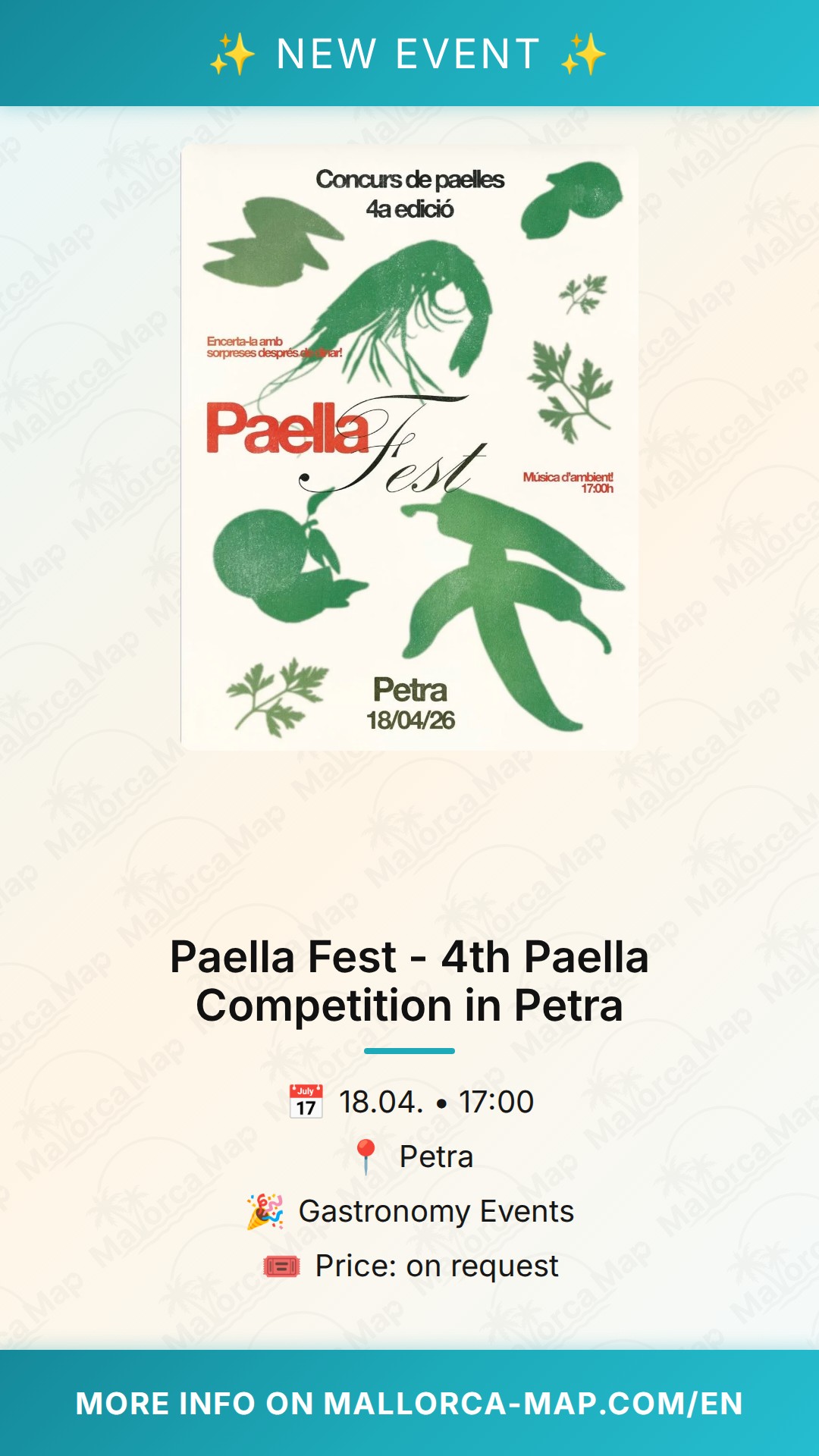 While the focus is on the competition, the event is a fantastic way to meet locals and experience the island beyond the typical tourist spots. Make sure to mark April 18th in your calendar. Whether you are coming from Palma or staying nearby in the Pla de Mallorca region, Petra is easily accessible and offers a truly unique experience during the Paella Fest. Don't forget to bring your appetite and your camera, as the sight of dozens of paellas cooking simultaneously is something you'll want to remember. We look forward to seeing you in Petra for an unforgettable evening of flavor and fun!