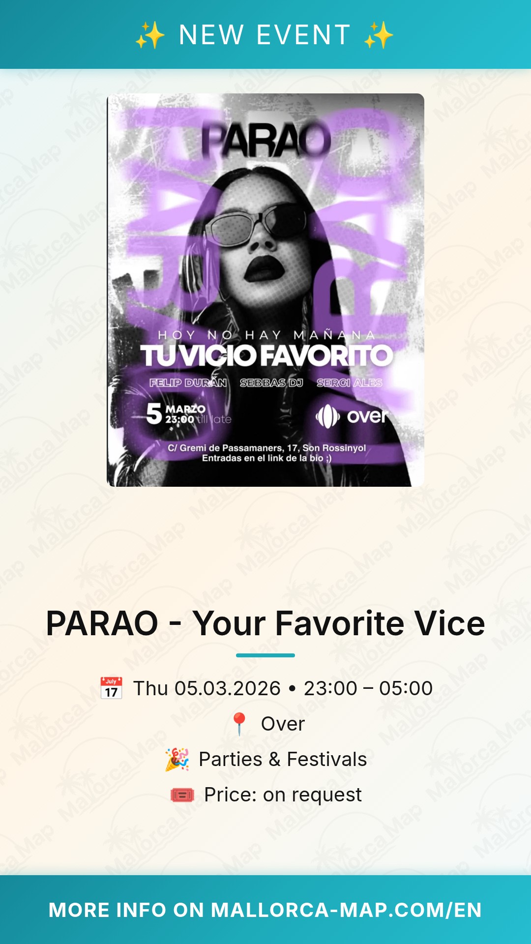 Are you ready to dive into the heart of Palma's legendary nightlife? PARAO returns with "Your Favorite Vice," a night dedicated to those who live for the beat and the electric energy of the dance floor. Located in the vibrant Son Rossinyol district at Over, this isn't just another party; it's a statement. If you're looking for the ultimate clubbing experience in Mallorca, you've found the right place to be on March 5th.