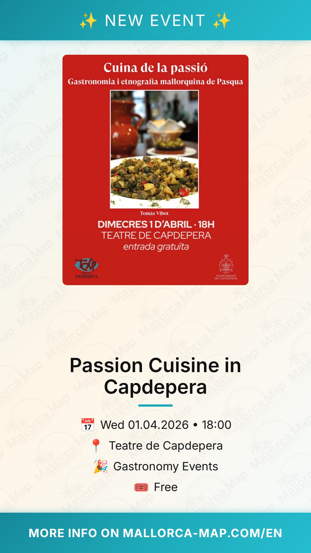 The event is completely free to attend, making it a perfect evening plan for families and curious travelers alike. Starting at 18:00, it leaves you plenty of time to enjoy a walk through the medieval streets of Capdepera or visit its famous castle before heading to the theatre. Don't miss this opportunity to connect with the authentic Mallorca. We invite you to grab a seat, listen to the stories, and maybe even discover a few culinary secrets to take home with you. See you at the Teatre de Capdepera for an unforgettable evening of culture, history, and taste!