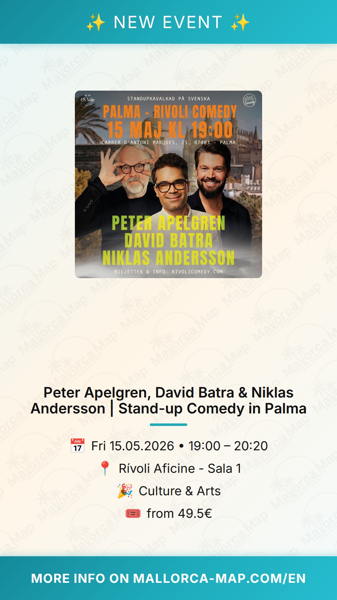 Get ready for a night of world-class laughter right in the heart of Mallorca. On May 15, 2026, the iconic Rívoli Aficine in Palma will host a powerhouse of comedy talent: Peter Apelgren, David Batra, and Niklas Andersson. If you are looking for an evening that combines sharp wit, brilliant storytelling, and high-energy performances, this is an event you simply cannot afford to miss.