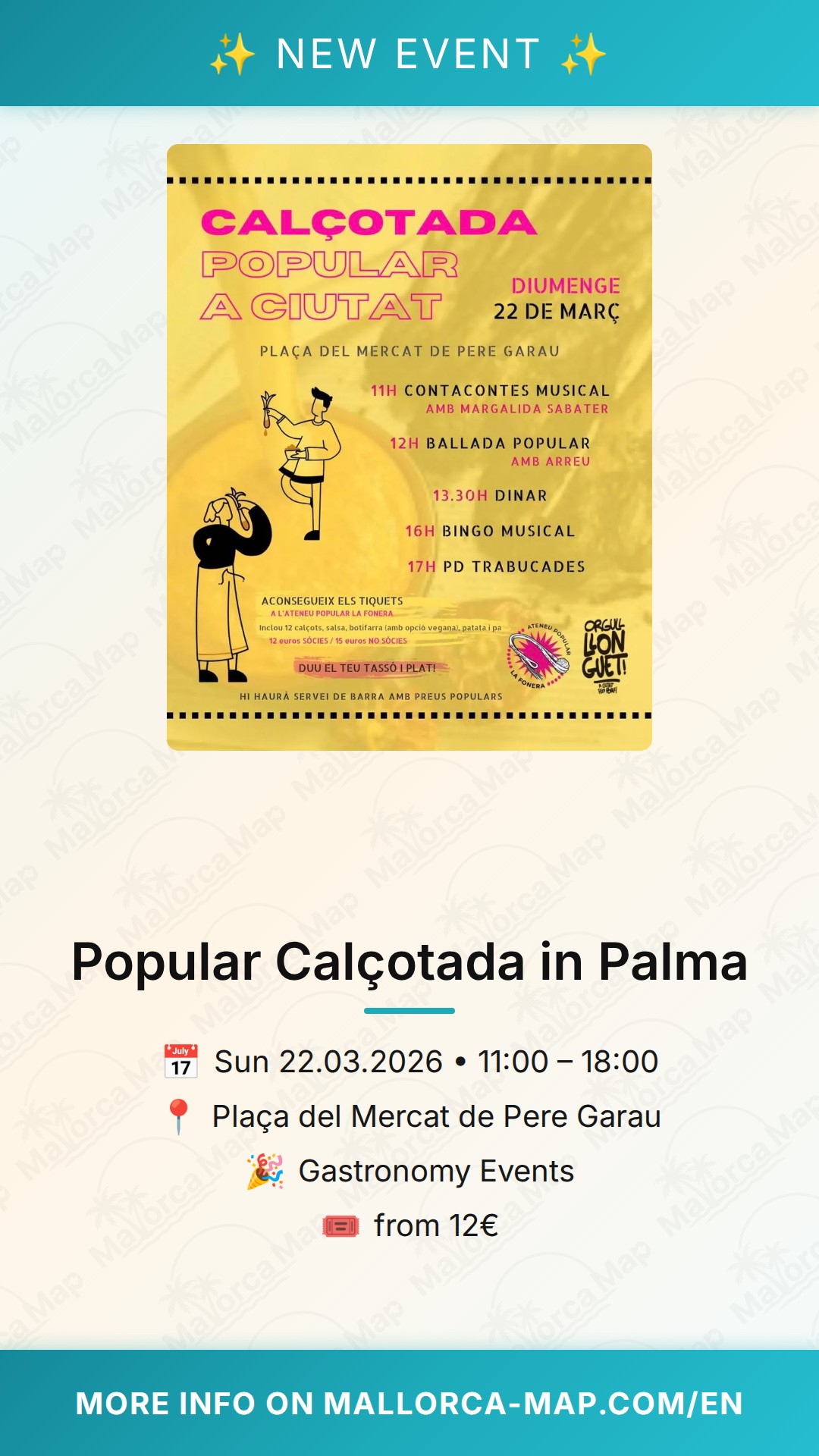 The event kicks off at 11:00 AM, making it the perfect plan for a long, relaxed lunch. Tickets are affordably priced between 12 and 15 Euros, offering great value for a full gastronomic experience. We recommend arriving early to soak up the atmosphere and secure your spot at the communal tables. Located in the multicultural and bustling Pere Garau neighborhood, the market square is easily accessible by public transport or a short walk from the center of Palma. Don’t forget to wear something comfortable—and perhaps something you don't mind getting a little sauce on! Come and celebrate spring with us at this wonderful community feast. Grab your friends, bring your appetite, and join us for a day of music, laughter, and the best calçots in town. See you there!