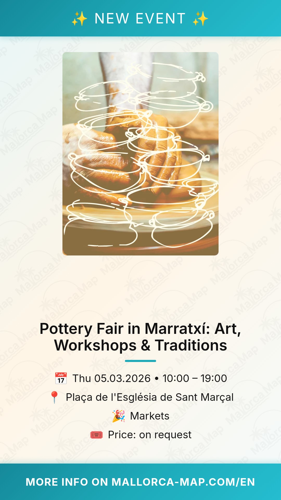 The fair kicks off at 10:00 AM, giving you plenty of time to explore the stalls and enjoy the local hospitality. Whether you are a serious collector of ceramics or just a curious traveler, the Pottery Fair offers a warm and welcoming environment. Make sure to wear comfortable shoes and bring your curiosity as you delve into one of Mallorca's most cherished artistic traditions. We hope to see you there for a day of creativity and island heritage!