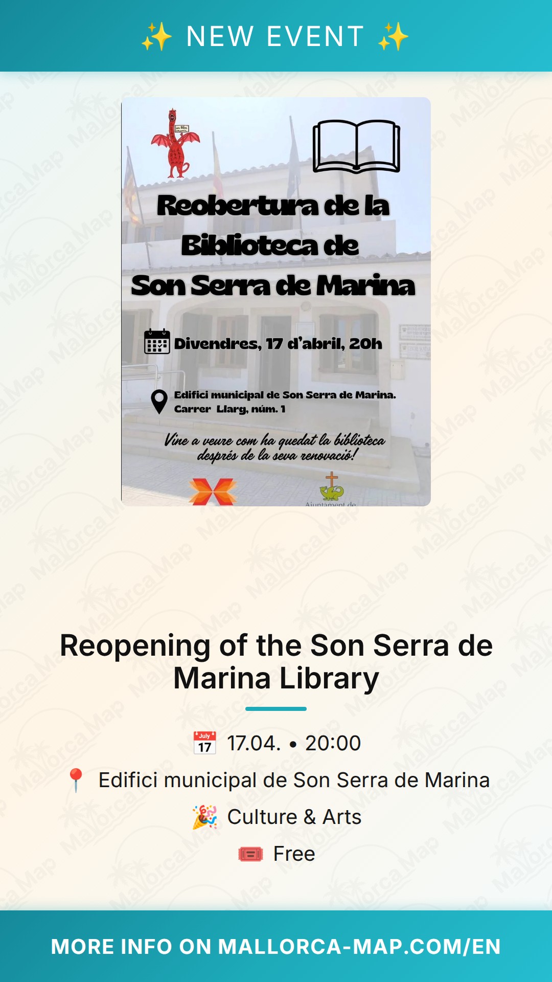 Don't miss this chance to support local culture in Mallorca. Mark your calendar for Friday, April 17th, and come celebrate the return of this essential service. We look forward to seeing you there at 8:00 PM for an evening dedicated to knowledge, stories, and the unique spirit of Son Serra de Marina. It’s more than just a building; it’s a place where your next adventure begins on the page. See you at the library!