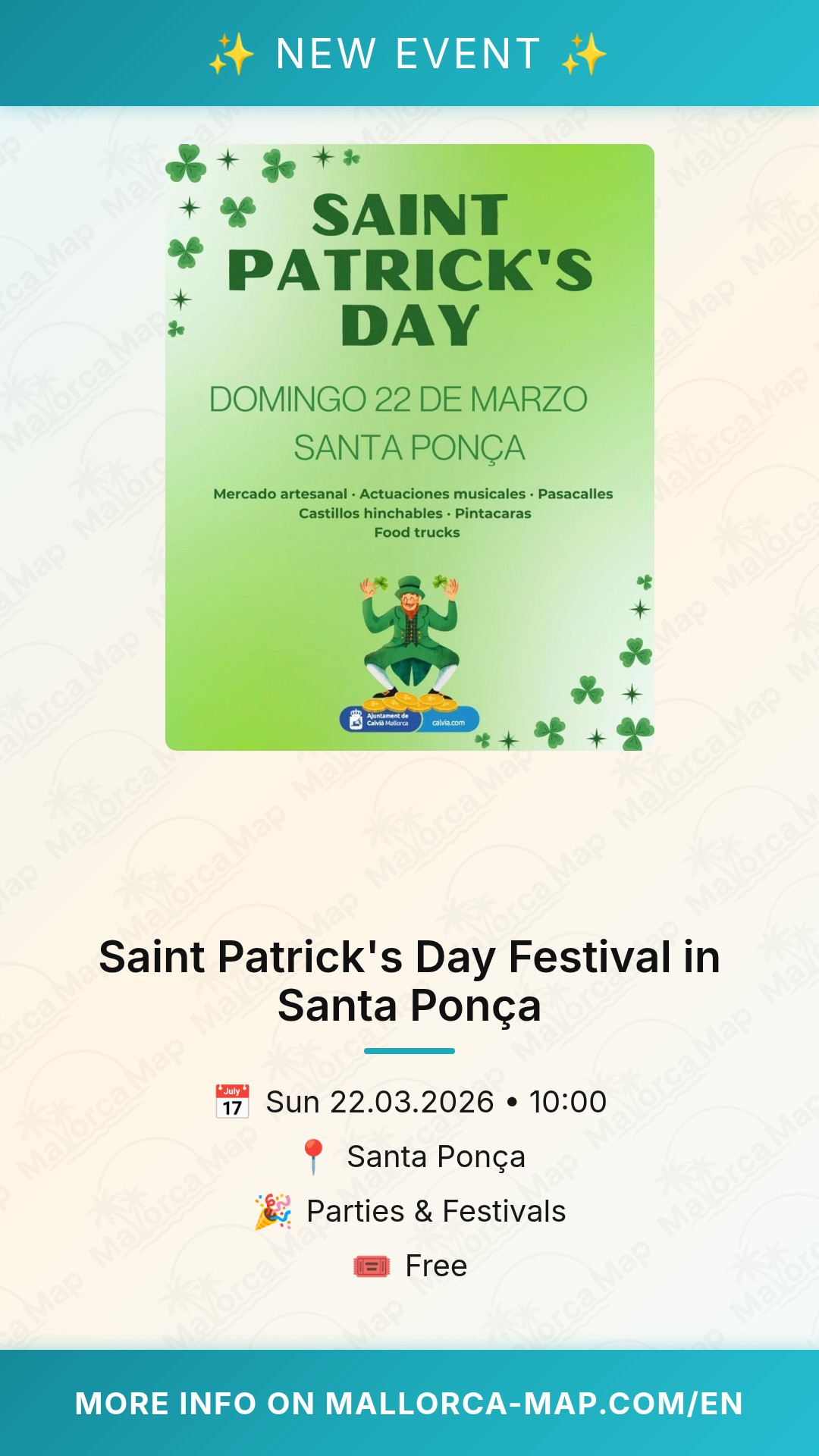 Don't miss out on this fantastic blend of Irish tradition and Mediterranean sunshine. Grab your friends, bring the whole family, and head down to Santa Ponça on March 22nd to celebrate Saint Patrick’s Day in style. See you there!