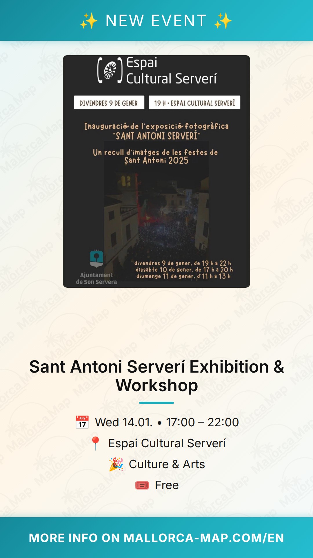You immerse yourself in the deep-rooted soul of the island at the Sant Antoni Serverí event, held in the picturesque town of Son Servera. Located at Carrer de Sant Antoni 23, the Espai Cultural Serverí becomes the stage for an evening dedicated to one of Mallorca’s most iconic winter traditions. Starting at 19:00, this gathering combines visual art and traditional music to honor the patron saint of animals in a way that resonates with both long-time residents and curious visitors. It is a time when the community comes together to celebrate their identity through cultural heritage and shared memories.