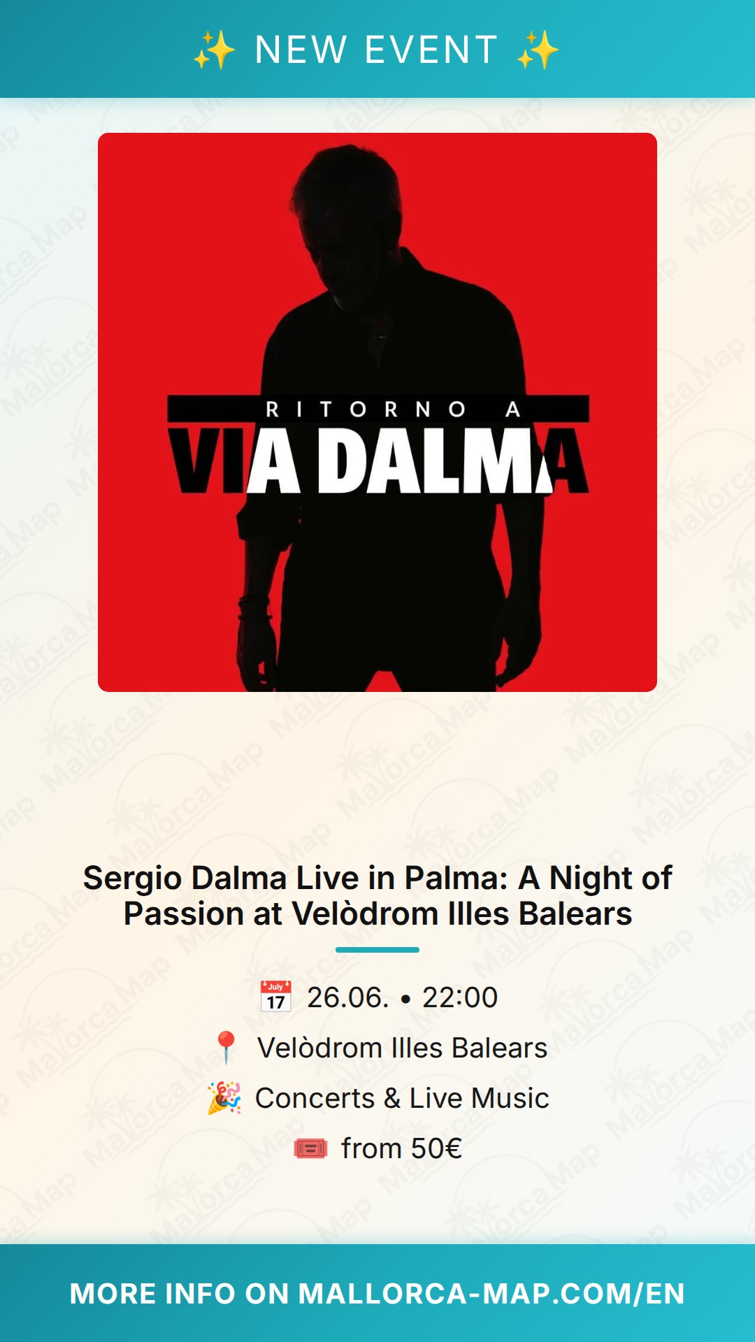Planning your trip to the venue is simple, and you will find plenty of opportunities to enjoy the local vibe before the show begins. Palma always comes alive during big concert nights, so why not make an evening of it? Enjoy a pre-show dinner in the city or head straight to the Velòdrom to soak in the anticipation with fellow fans. For all the latest updates, event details, and ticket booking links, head over to mallorca-map.com/en. We look forward to seeing you there for a night of pure musical magic. Don't wait—secure your tickets now and get ready to sing along to your favorite Sergio Dalma anthems in the beautiful setting of Palma!