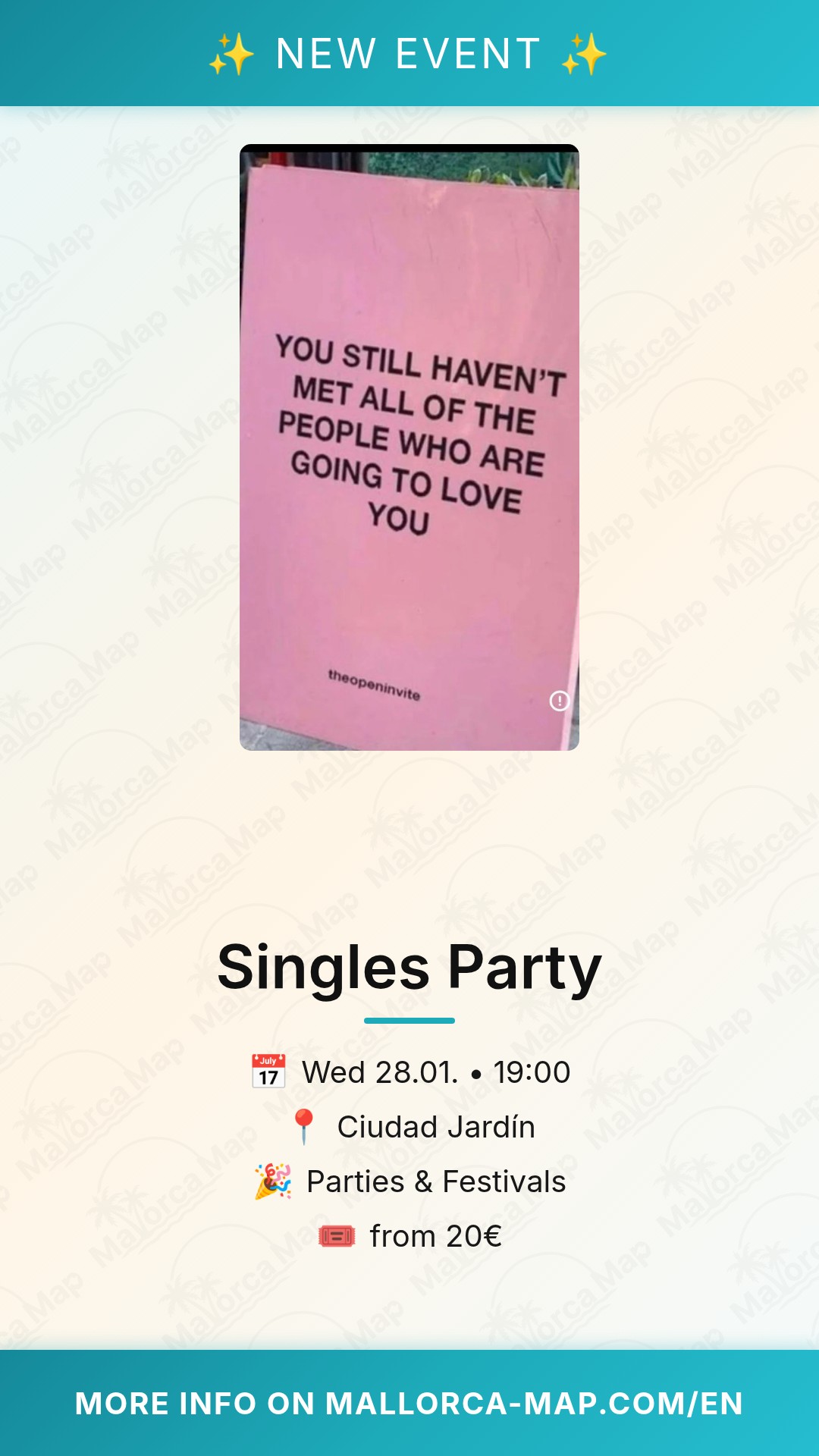 The event focuses on creating genuine connections between people. Whether you are looking for a new friendship, a romantic spark, or simply a great night out, the Singles Party offers a curated experience. Since registration is required, you can expect a well-organized evening where everyone is there with the same goal: meeting new people. The venue in Ciudad Jardín provides a stunning backdrop, known for its relaxed seaside vibe and proximity to the center of Palma. Make sure to secure your ticket early, as this popular gathering attracts a diverse crowd of locals and expats alike.