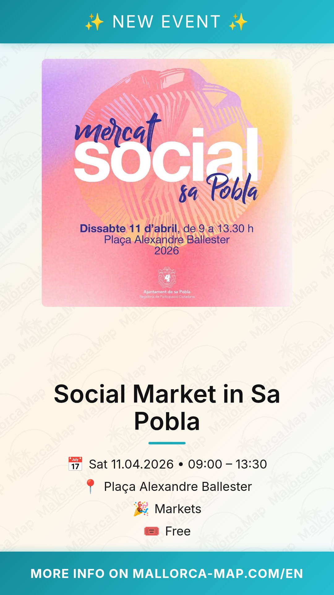 Make sure to mark your calendar for April 11th. Whether you are a local resident or a traveler seeking a deeper connection with the island, the Social Market in Sa Pobla offers a unique glimpse into the town's social dynamics. Bring your family, meet the locals, and enjoy a morning filled with community spirit and participation. We look forward to seeing you in the heart of Sa Pobla for this special gathering!