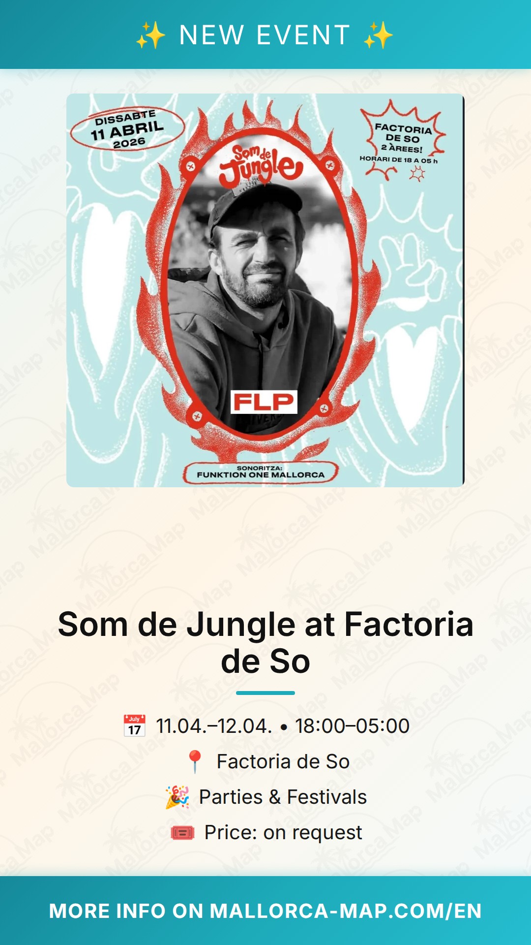 Factoria de So has long been a sanctuary for alternative arts and music, and hosting an event like this reinforces its reputation as a cultural hub in the Santa Maria area. You will find yourself surrounded by like-minded individuals who appreciate the technical skill of the DJs and the complex layers of jungle rhythms. The event kicks off at 18:00 on April 11th, 2026. This start time allows you to soak in the atmosphere as the sun sets over Santa Maria del Camí before the intensity ramps up. Located at Carrer de la Fàbrica, 2, the venue is easily accessible. Whether you are a seasoned jungle veteran or just looking for a unique night out in Mallorca, Som de Jungle promises a night of unforgettable sounds and community spirit. Grab your friends and get ready to experience the jungle vibe in the heart of the island.