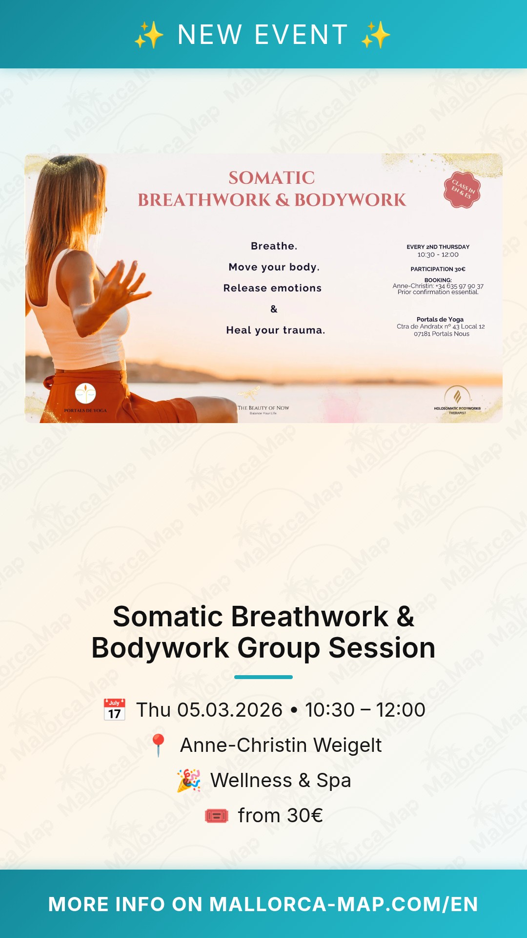 Are you looking for a way to reconnect with your inner self and release the accumulated stress of daily life? Join us for a transformative Somatic Breathwork & Bodywork Group Session led by Anne-Christin Weigelt. This session is designed to guide you through a profound journey of self-discovery and physical release, right here in the serene environment of Mallorca.