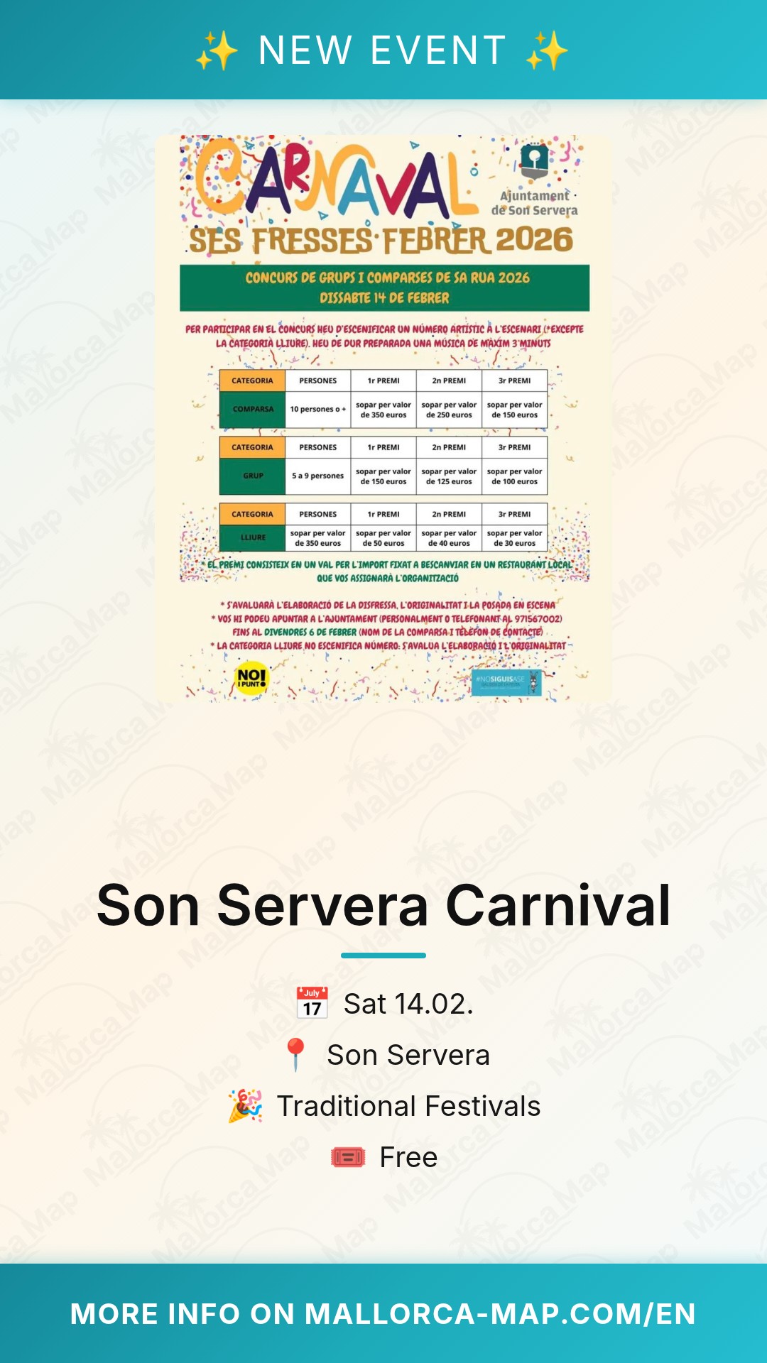 Access to this spectacular event is completely free of charge, making it an ideal day out for visitors and residents alike. We recommend arriving early to secure a good spot along the parade route near the town square to fully enjoy the vibrant atmosphere. After the competition, the celebration continues in the local establishments throughout the town, where you can toast to the winners. Join the community and witness the magic of the 2026 Carnival season in one of Mallorca's most welcoming locations!