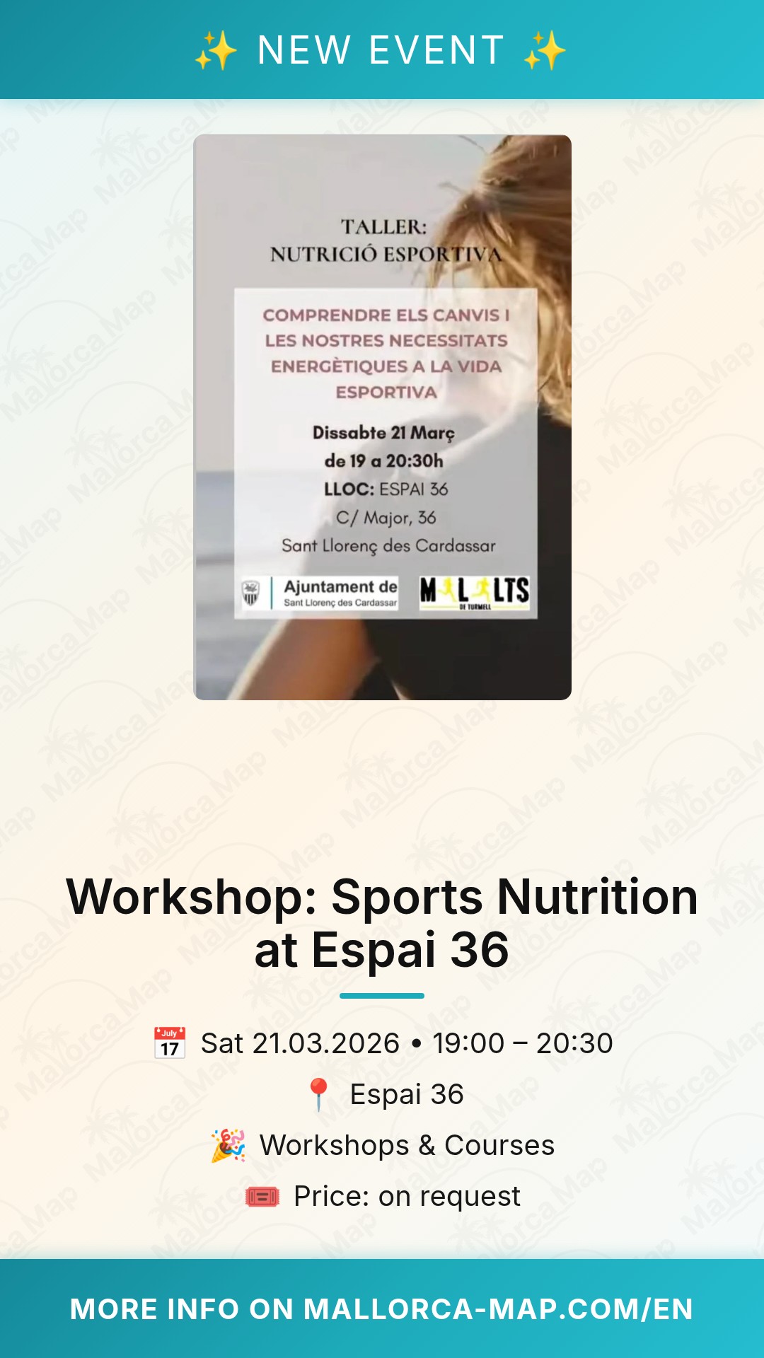 The workshop begins at 19:00 on March 21, 2026. You can find us at Carrer Major 36 in Sant Llorenç. While the event is listed with a starting price of 0, we recommend checking with the organizers at Espai 36 for any specific registration requirements to ensure your spot is secured. Don't miss this chance to invest in your health and gain the knowledge you need to reach your peak performance right here in Mallorca. We look forward to seeing you there!