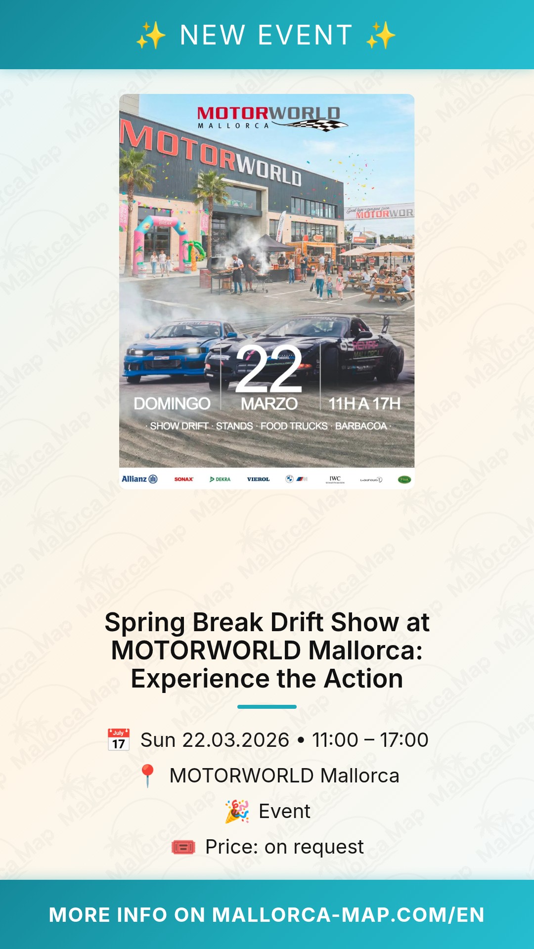 Get ready for an adrenaline-fueled day at the Spring Break Drift Show, hosted at the iconic MOTORWORLD Mallorca. If you are a fan of high-octane motorsports, precise vehicle control, and the smell of burning rubber, this is the place to be on March 22, 2026. This event brings together the best drift talent to showcase their skills on the track, offering spectators a front-row seat to some of the most exciting automotive maneuvers on the island.