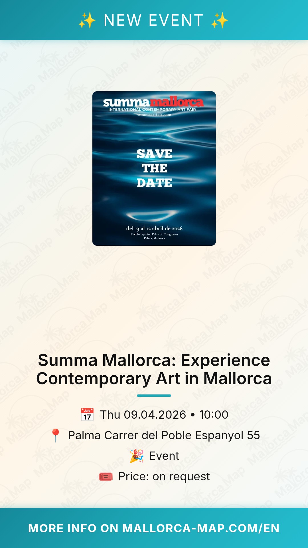 Make sure to mark your calendar for April 9, 2026, and plan your visit accordingly. While you are there, take the time to enjoy the unique ambiance that only a high-caliber art fair in Mallorca can provide. We recommend arriving early to fully enjoy the exhibits at your own pace and to ensure you have plenty of time to chat with the gallery representatives and artists on site.