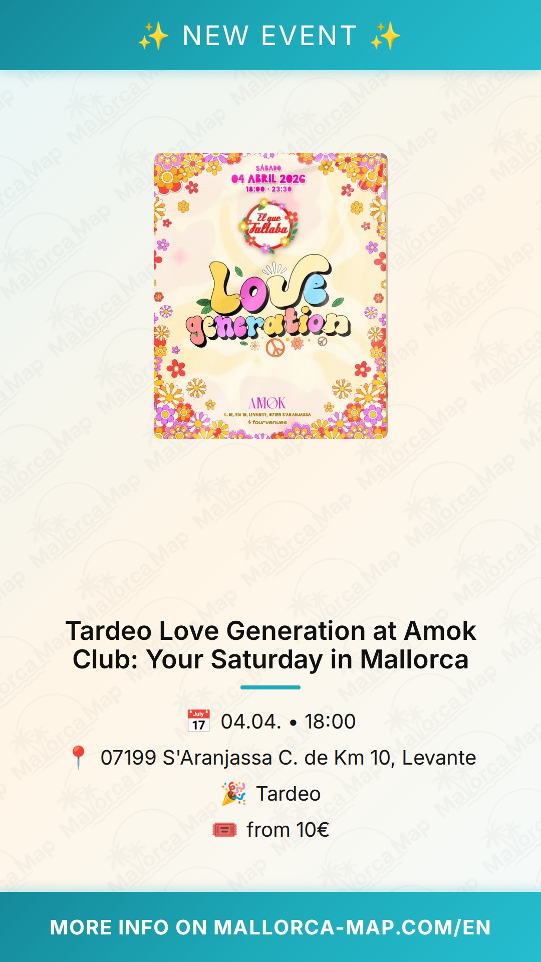 Get ready for the ultimate weekend vibe! The Tardeo Love Generation event at Amok Club is the perfect way to kick off your Saturday in Mallorca. If you are looking to embrace the local tradition of 'tardeo'—that unique Spanish culture of starting the party early in the afternoon—then this is exactly where you need to be.