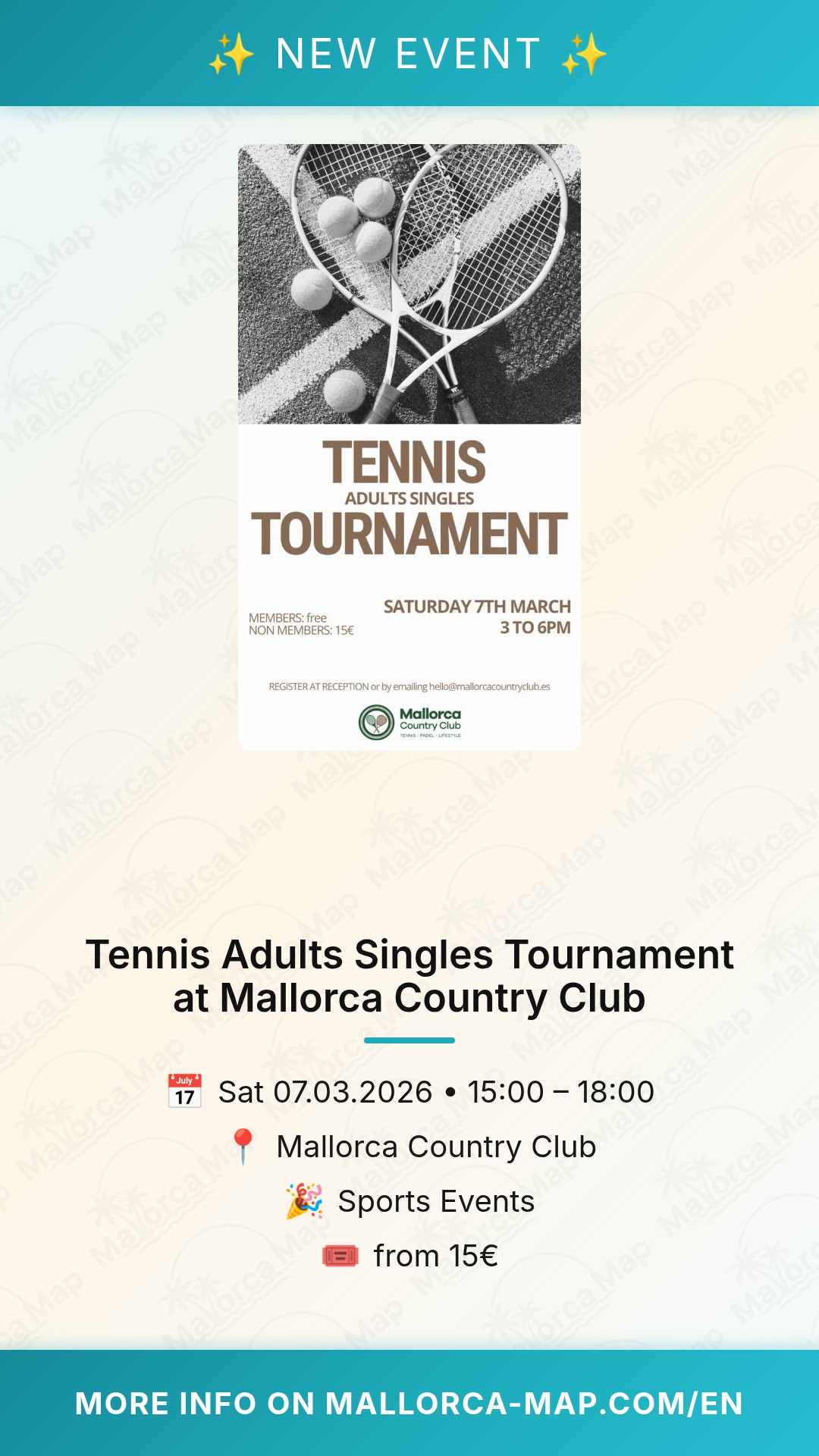 Please keep in mind that registration is required to participate in the draw. You can easily sign up by visiting the club’s reception in person or by sending an email to the organizing team. We recommend registering as soon as possible to ensure you don't miss out on a spot in the bracket. Bring your best gear, your fighting spirit, and your love for the game to Santa Ponça this March. We look forward to seeing you at the Mallorca Country Club for an afternoon of exceptional tennis and great sportsmanship. Don't miss your chance to be part of this exciting singles tournament!