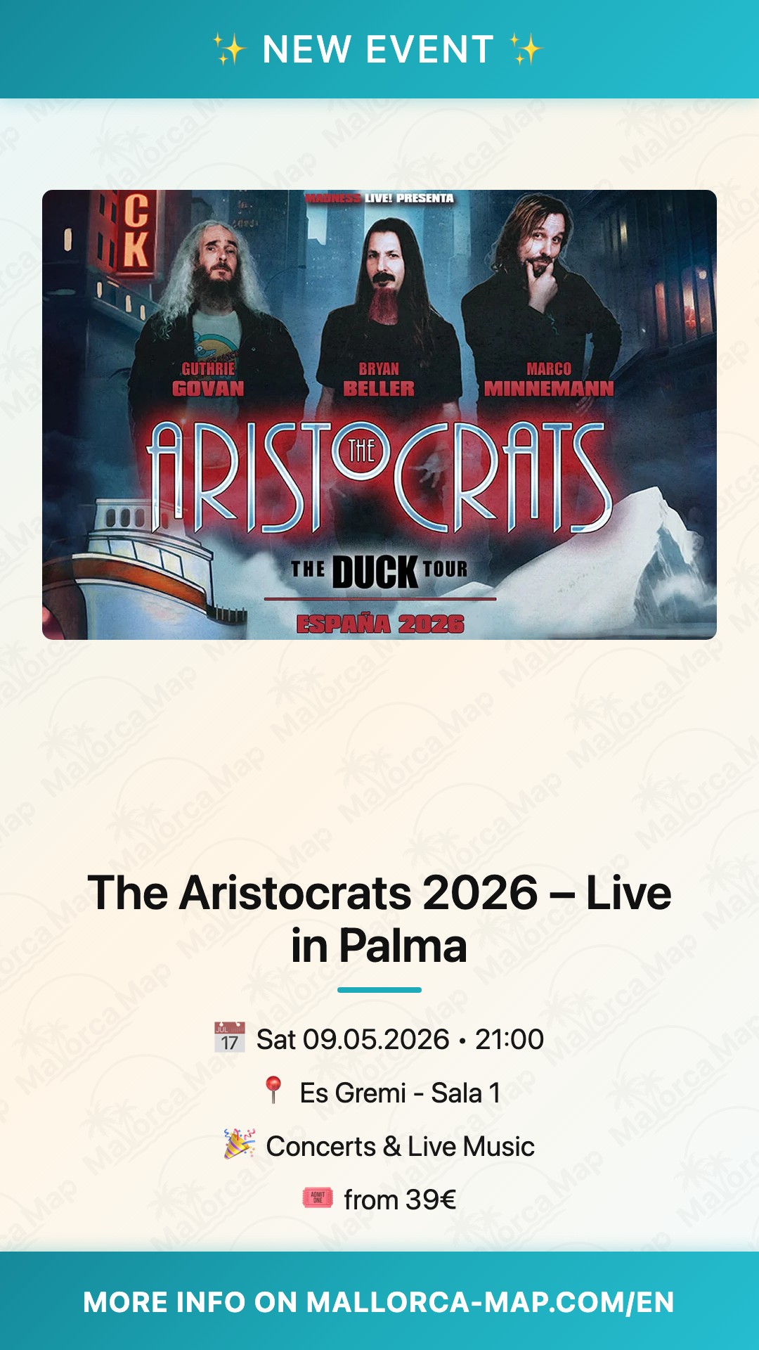 Expect a setlist packed with high-octane riffs, lightning-fast solos, and spontaneous jams that keep every show unique—no two nights are ever the same. Their new album Duck, released in February, brings fresh chaos to the stage, mixing virtuosic instrumentation with witty storytelling that’ll have you laughing and headbanging in equal measure. In the heart of Palma’s vibrant scene, Es Gremi presents this powerhouse performance, where the trio’s chemistry shines amid the historic charm of Gremi de Porgadors. Whether you’re a prog rock aficionado or just crave live music that defies genres, this is fusion at its most thrilling.