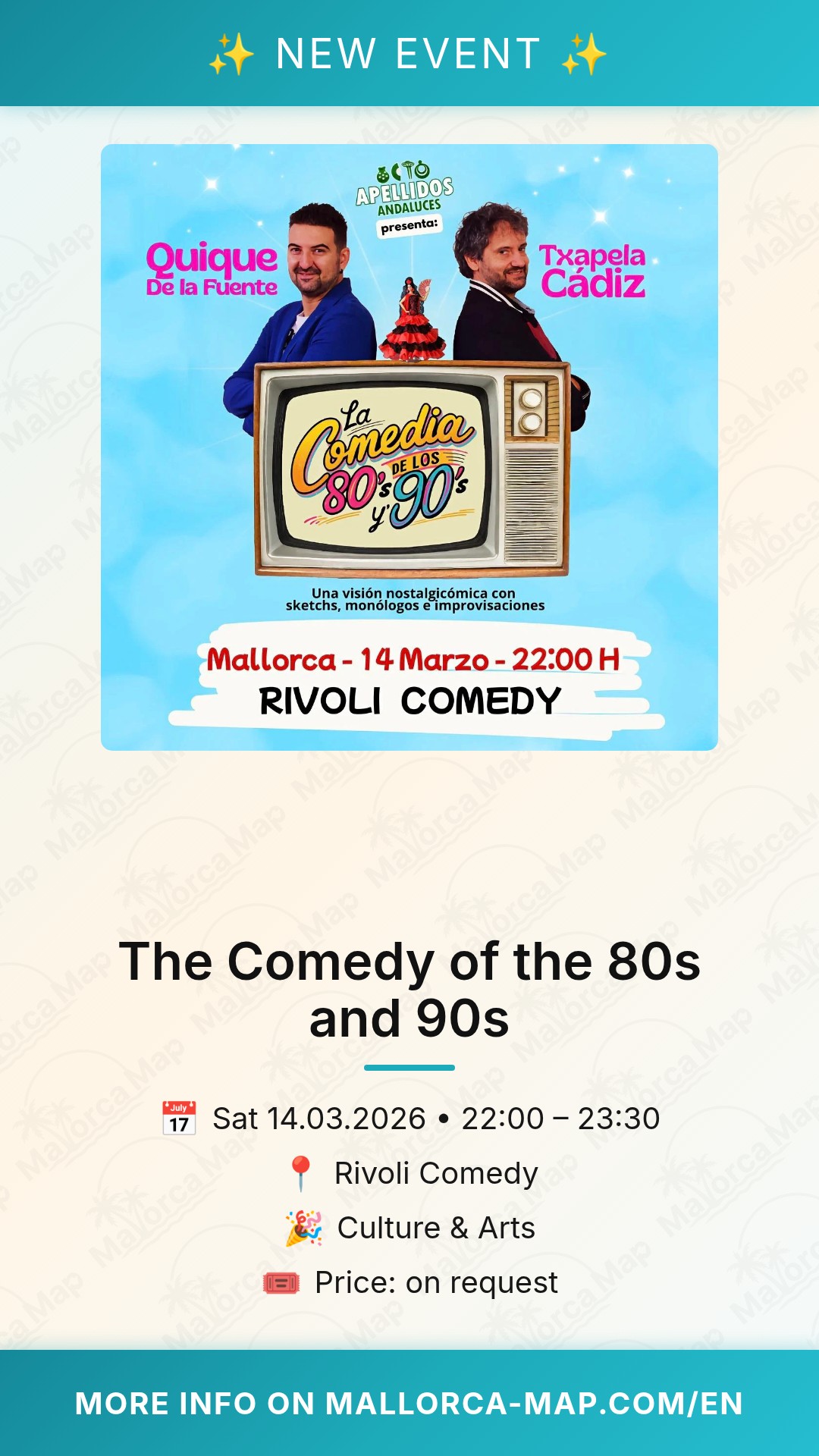 Don't miss out on this unique comedic experience in Mallorca's capital. Grab your tickets and get ready to laugh until it hurts. You will find that the humor of the 80s and 90s is timeless, especially when delivered by such talented comedians. See you at Rivoli Comedy for a night where the past meets the present in the funniest way possible! It is the ultimate night out for anyone who loves comedy and a good throwback.