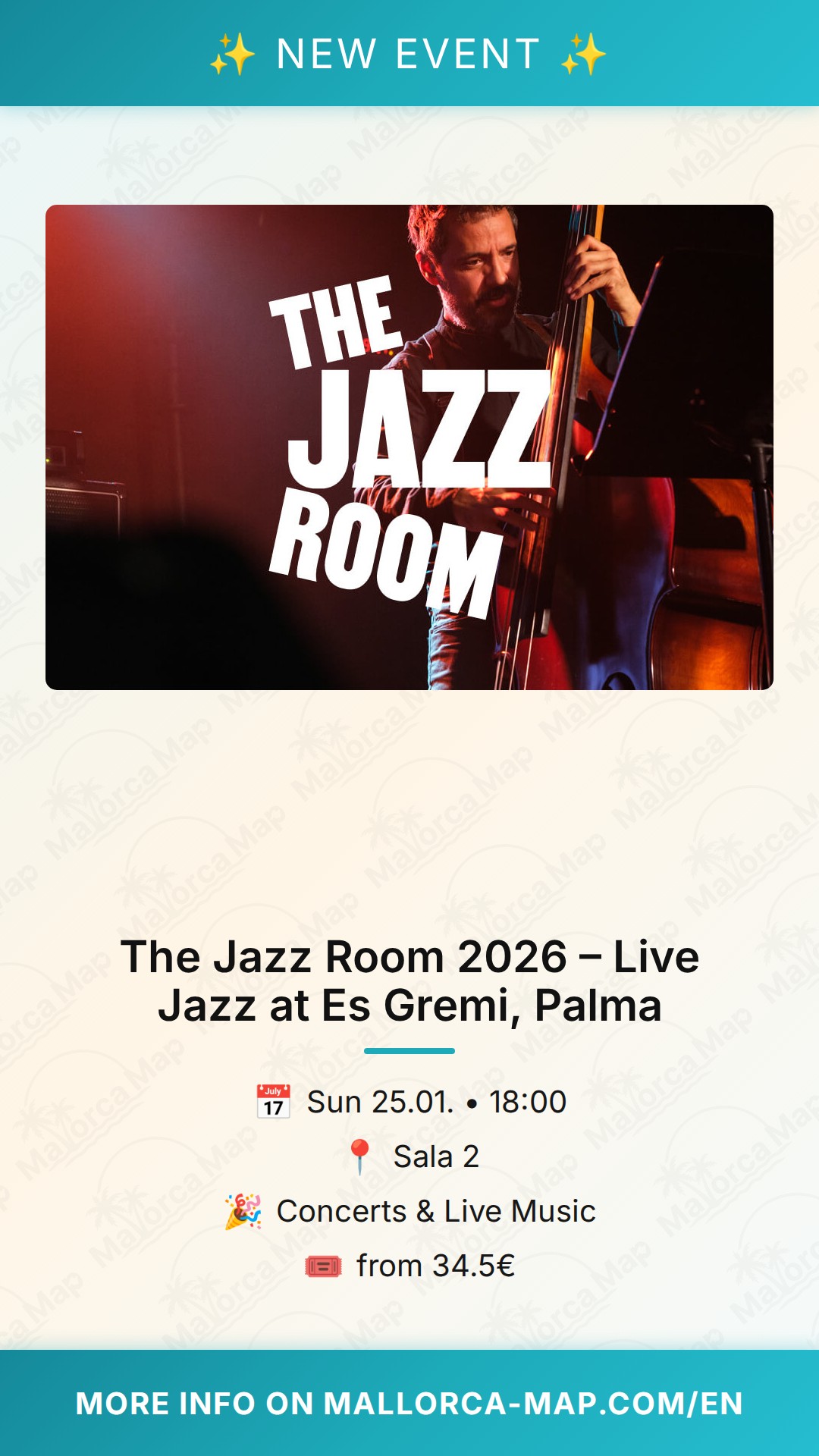 Starting at 6:00 PM, this is the perfect way to spend a Sunday afternoon and evening in Palma. Given the popularity of this series, it is wise to check for availability early, as these sessions are known to attract a dedicated following of local and international jazz lovers. While the event is part of a premium musical circuit, it remains an accessible cultural highlight for anyone living in or visiting Mallorca. We recommend arriving a little early to find a comfortable spot in the bar and soak in the pre-show ambiance. Don't miss the chance to witness one of the most vibrant live music sessions on the island.