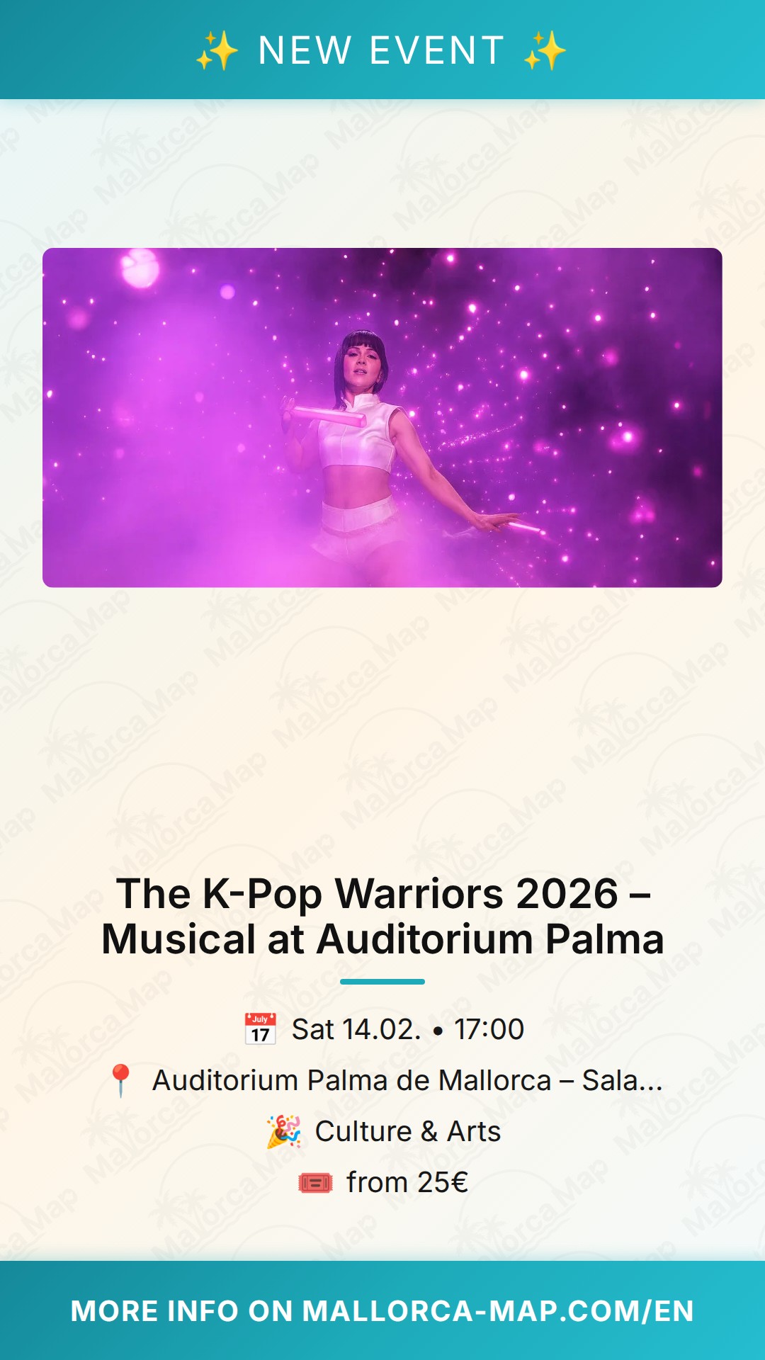 You step into a world of neon lights and pulsating beats as the magic of Korean pop arrives at the Auditorium Palma de Mallorca. On February 14, 2026, the Sala Magna hosts a truly unique event: The K-Pop Warriors – Live Musical Tribute. This high-energy production brings the vibrant aesthetics and catchy melodies of Seoul to the shores of Palma. It is an afternoon where music meets storytelling, creating a festive atmosphere that captures the essence of modern pop culture. You will find yourself swept away by the enthusiasm of the performers and the high-quality production values that this iconic venue is known for.